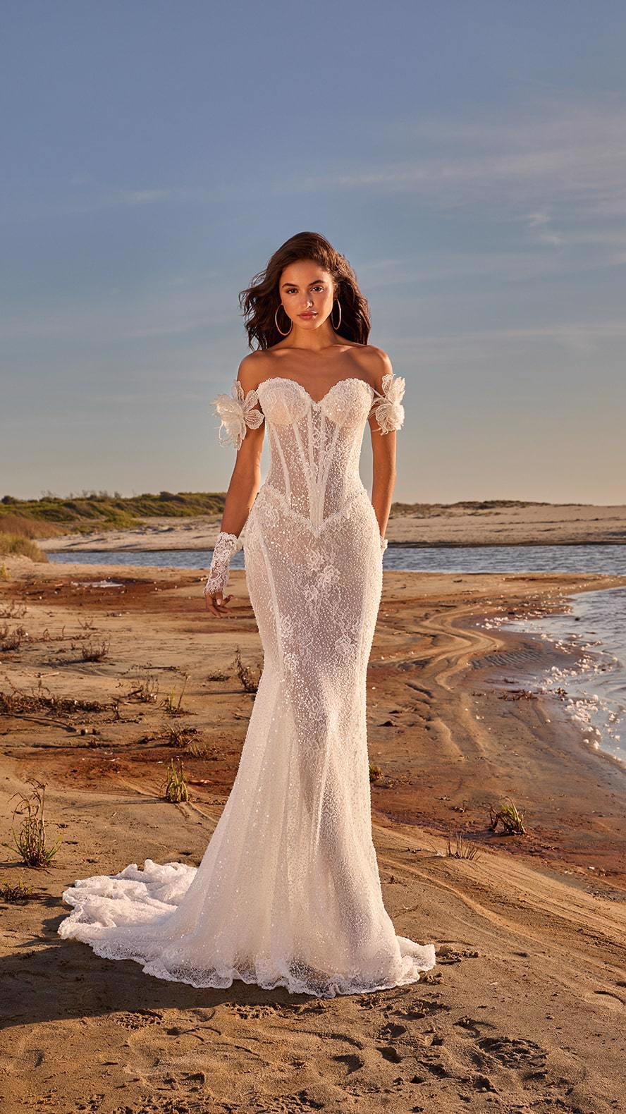 De Vision trouwjurk van het exclusieve merk Galia Lahav is een adembenemende Fit & Flare creatie die pure glamour uitstraalt. Gemaakt van sprankelend kant en pailletten, combineert de jurk een sweetheart lijfje met een sexy, see-through ontwerp dat perfect aansluit op het lichaam. De met opvallende bloemen bedekte schouderbandjes kunnen ook off-shoulder worden gedragen. Het spectaculaire silhouet wordt geaccentueerd door opvallende geborduurde bloemen aan de halslijn, en optioneel zijn er bijpassende mouwtjes voor extra elegantie. Een echte eyecatcher voor de bruid die wil stralen op haar grote dag. Deze jurk is tevens erg mooi als second look voor het feest in de avond.