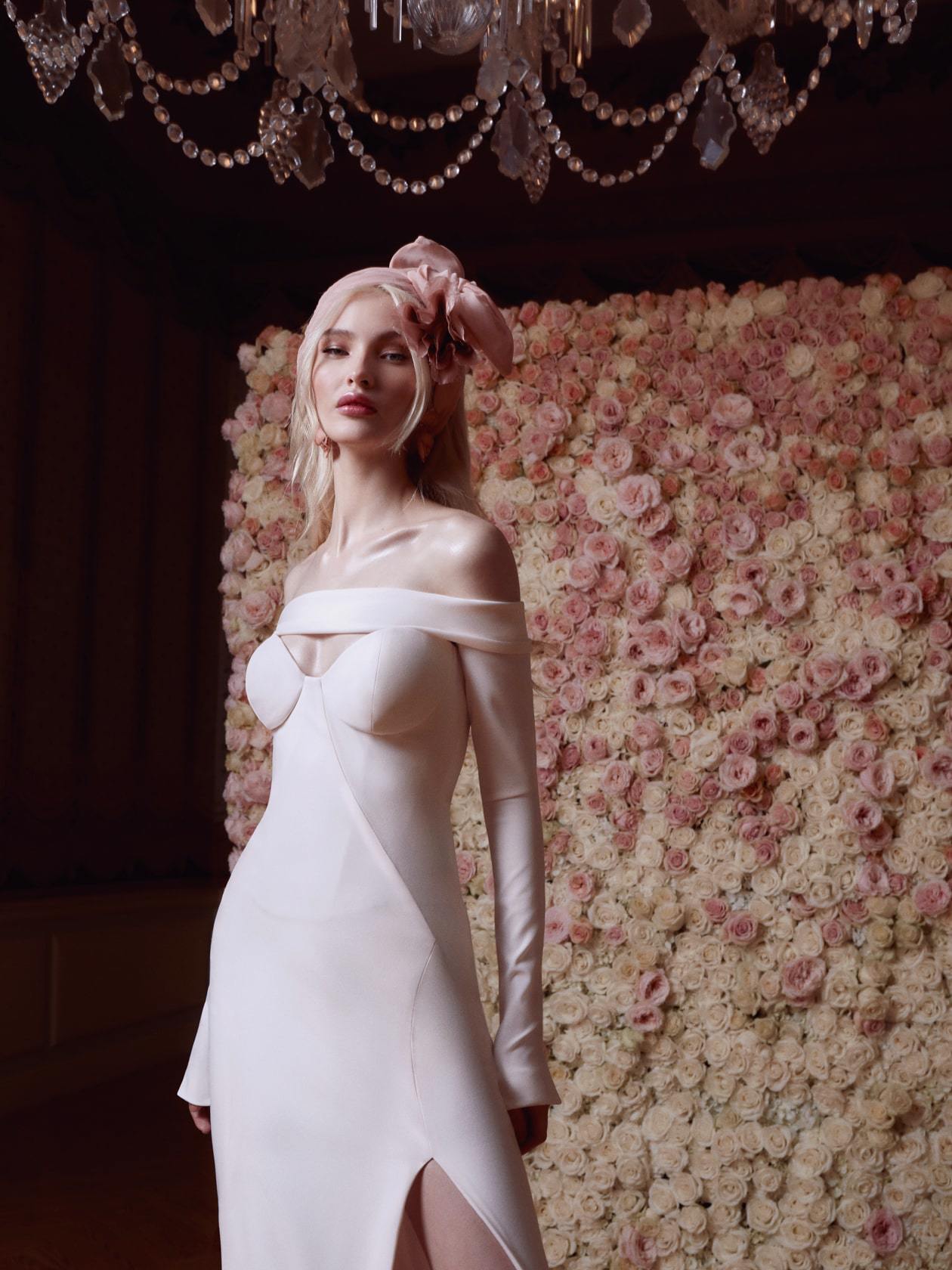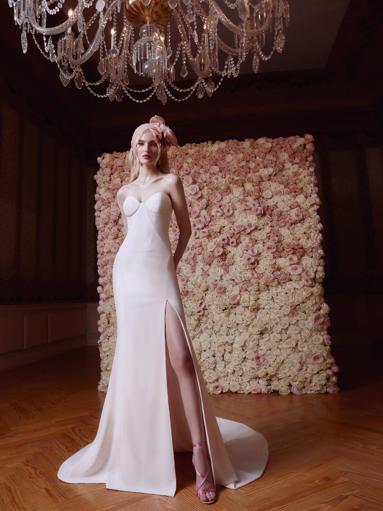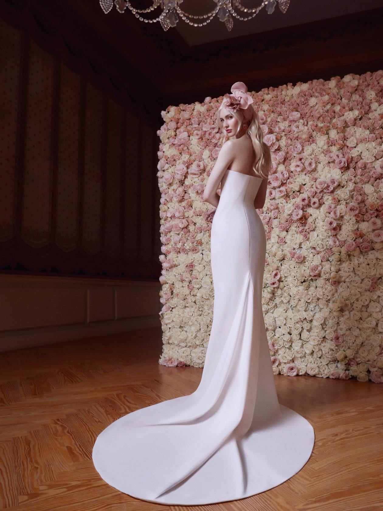 Straal in de minimalistische trouwjurk van Galia Lahav. De Yael van de Bridal Gala van Galia lahav is te bestellen met een bijpassende off-shoulder bolero.