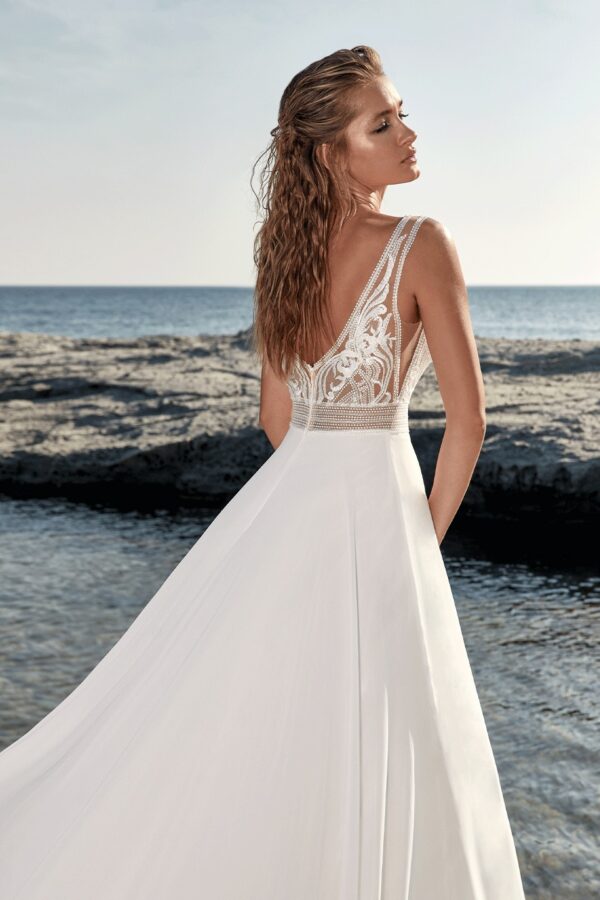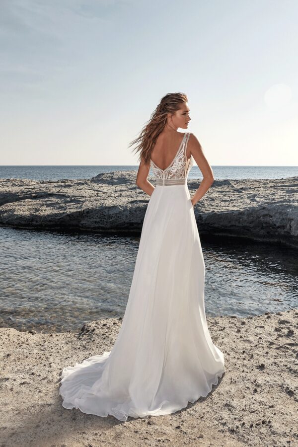 Delicaat Frans bohemian kant op het romantische doorschijnende lijfje, een diepe v-hals, zijuitsnijdingen... Deze prachtige jurk heeft het allemaal! Vanuit de met kralen versierde tailleband loopt de elegante zwierige rok. Deze zorgt voor een mooi a-lijn silhouet.