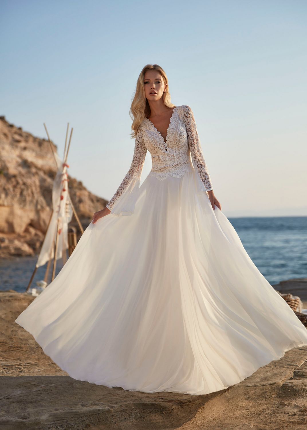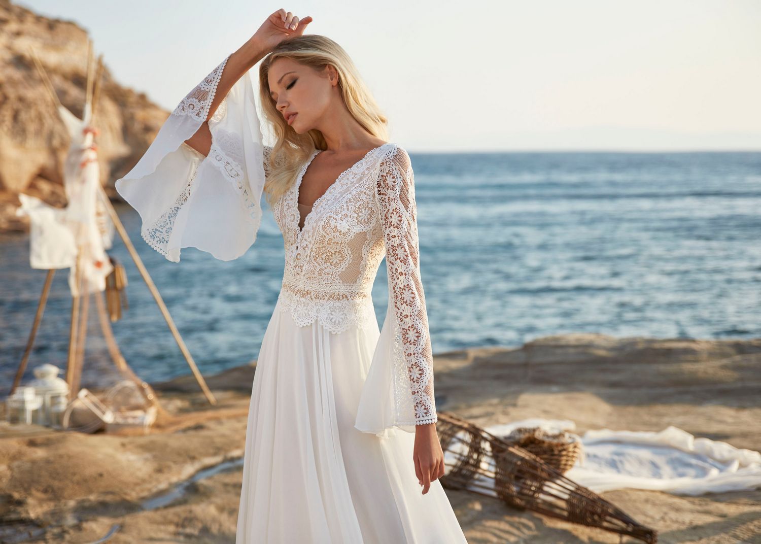 Deze romantische Boho trouwjurk is van het merk Herve Paris. Een heel mooi zacht kanten lijfje met een uitlopende mouw, diepe rug en een soepelvallende rok. Een jurk die zowel op het strand als in een tuinbruiloft uitstekend past.