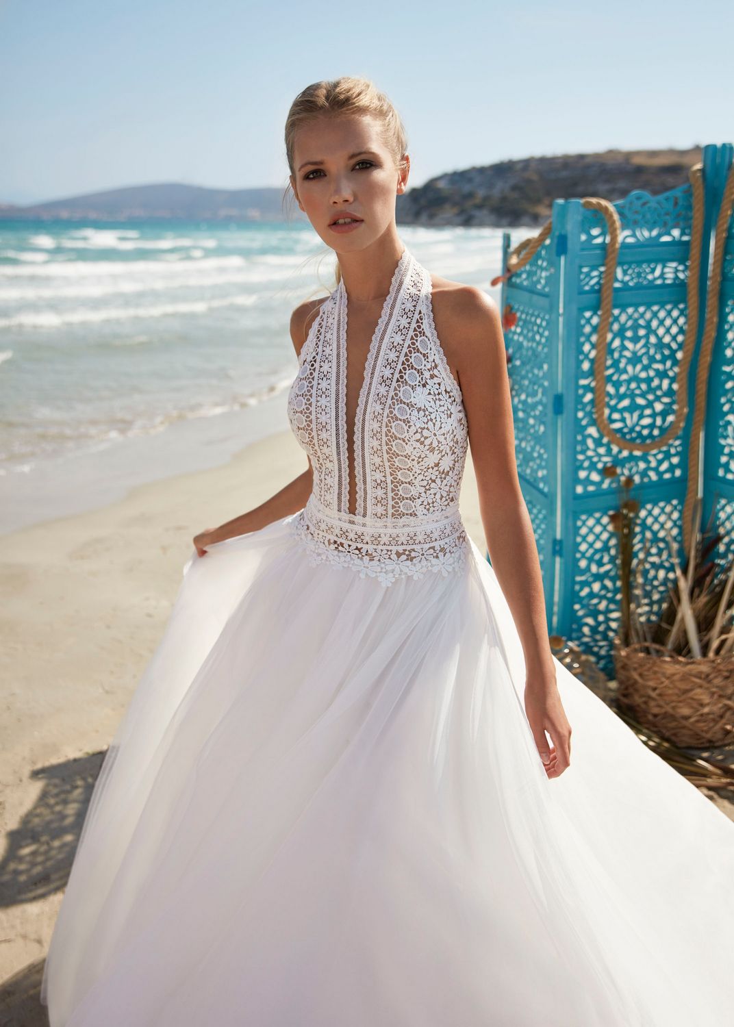 Deze jurk van het merk Herve Paris is een Boho trouwjurk met een knipoog naar een princess jurk. De rok is van tule en kan zowel met als zonder onderrok gedragen worden. Het lijfje is uniek doordat deze een diepe halslijn heeft, maar wel een hoge halter van vintage kant. Het onderlijfje heeft een ondertoon waardoor het kant extra diepte krijgt. Een jurk die heel goed gedragen kan worden bij bijvoorbeeld een tuinfeest.