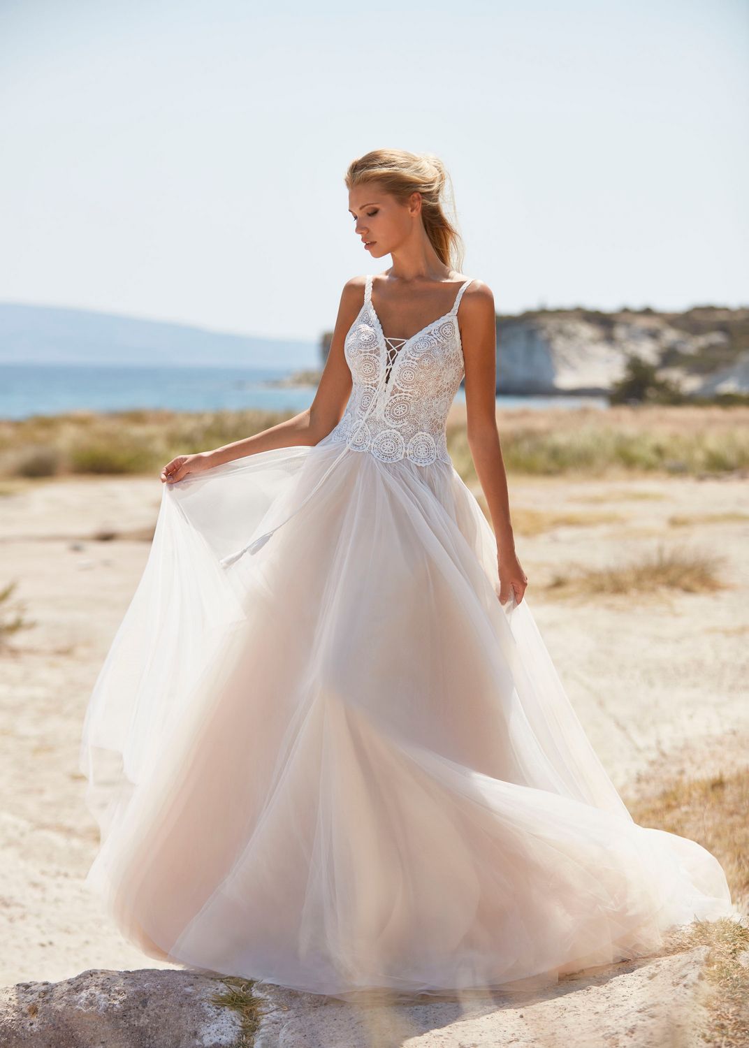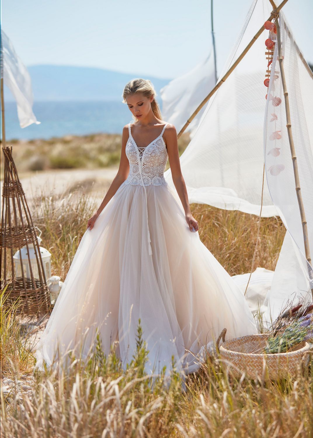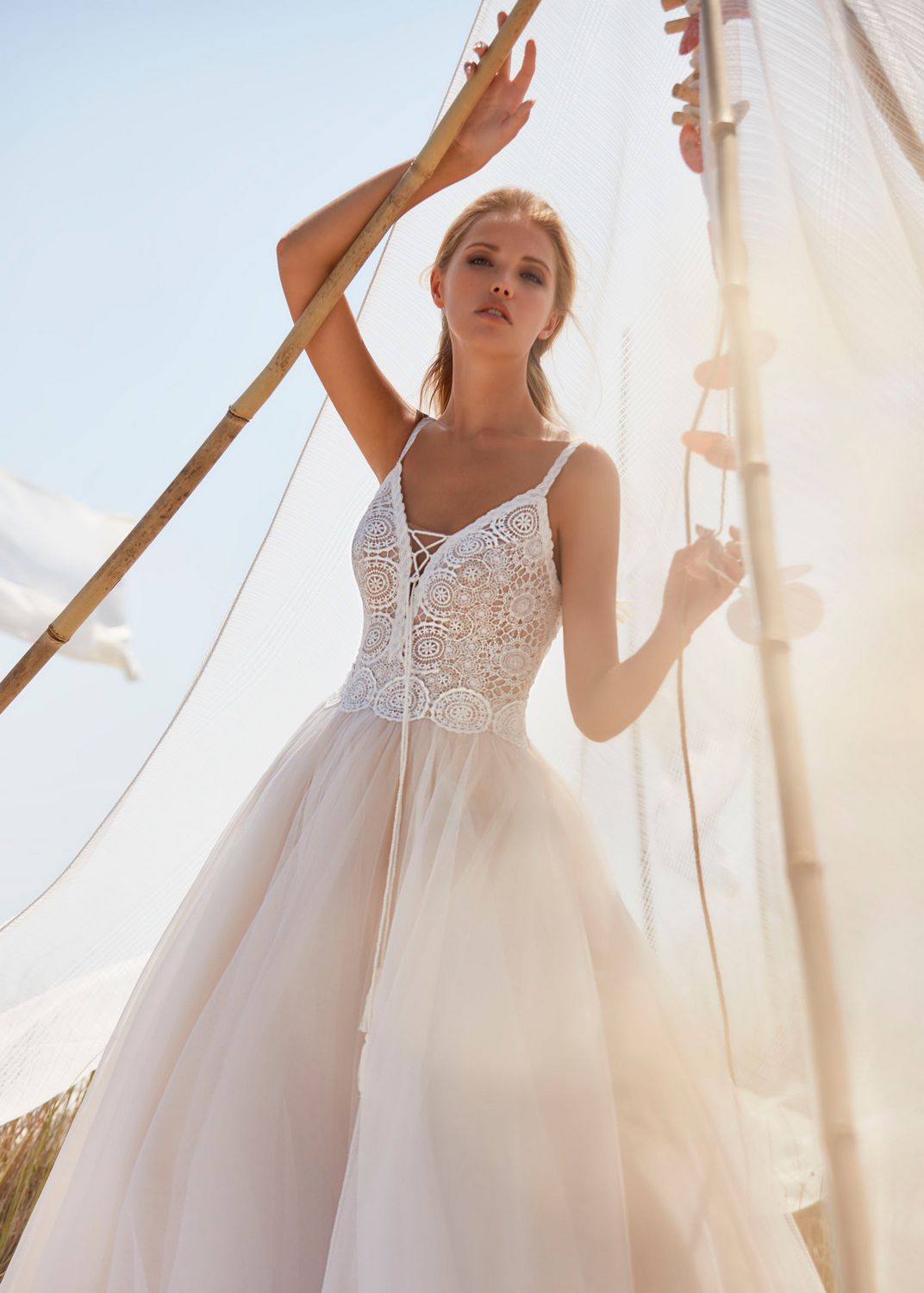 Deze jurk van het merk Herve Paris is een echte droomjurk. Een zacht soepelvallende rok van tule en een een mooi Boho kanten lijfje. Een leuk detail is de veter in de v-hals wat het geheel wat speelser maakt. Een echte jurk voor de speelse bruid.