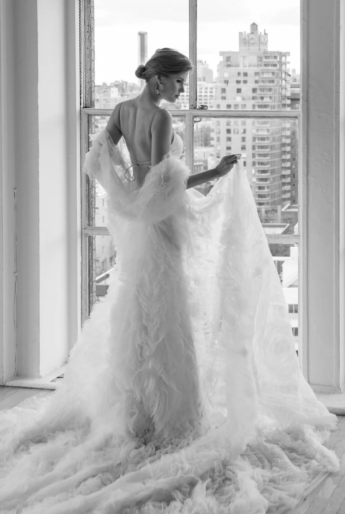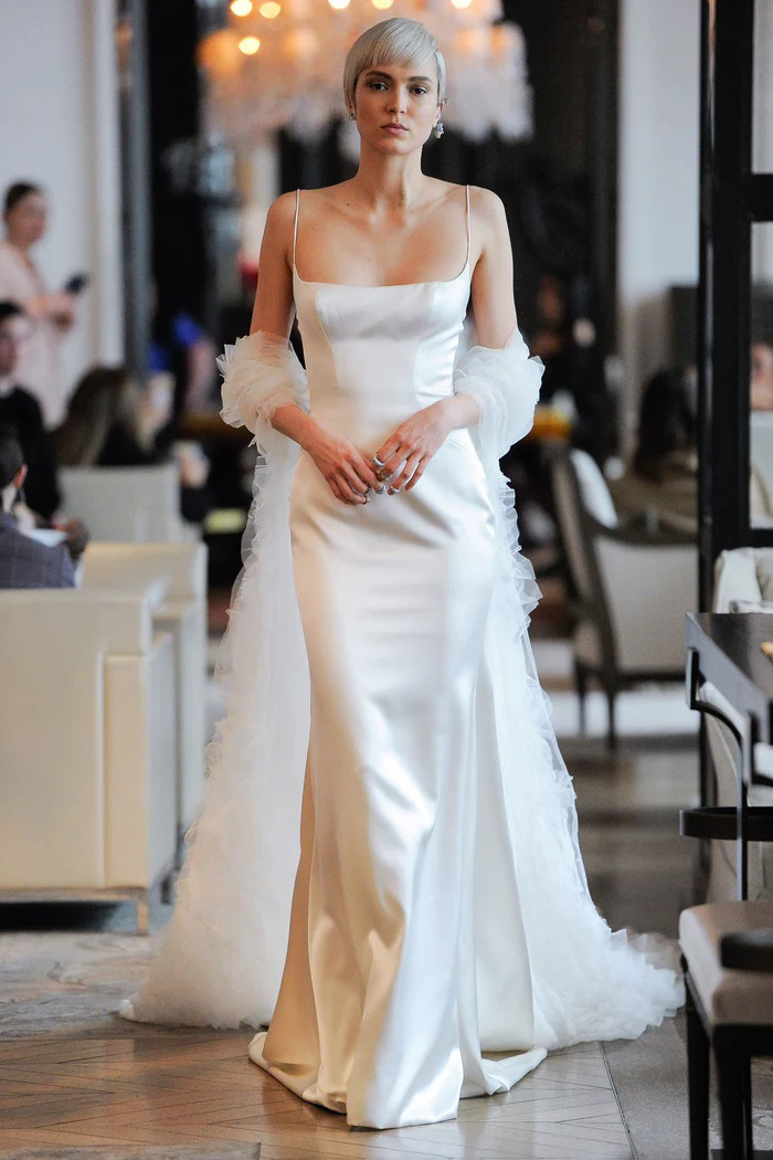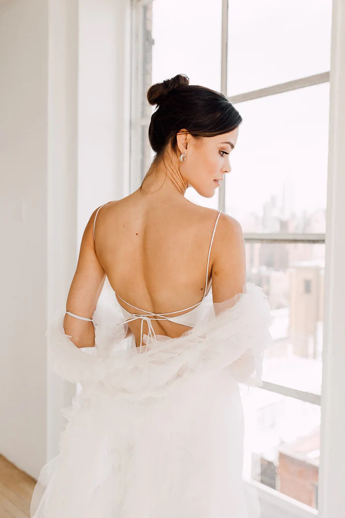 De Robin trouwjurk van het exclusieve merk Ines di Santo is een luxe, zijden jurk met een minimalistisch design en een sexy open rug. Met de smalle spaghettibandjes en de elegante ruffle cape krijgt de jurk een vrouwelijke, sensuele uitstraling. Je kunt de couture jurk zowel met als zonder de bijpassende cape dragen. De Robin is een stijlvolle en veelzijdige look en zal je laten stralen op je grote dag.