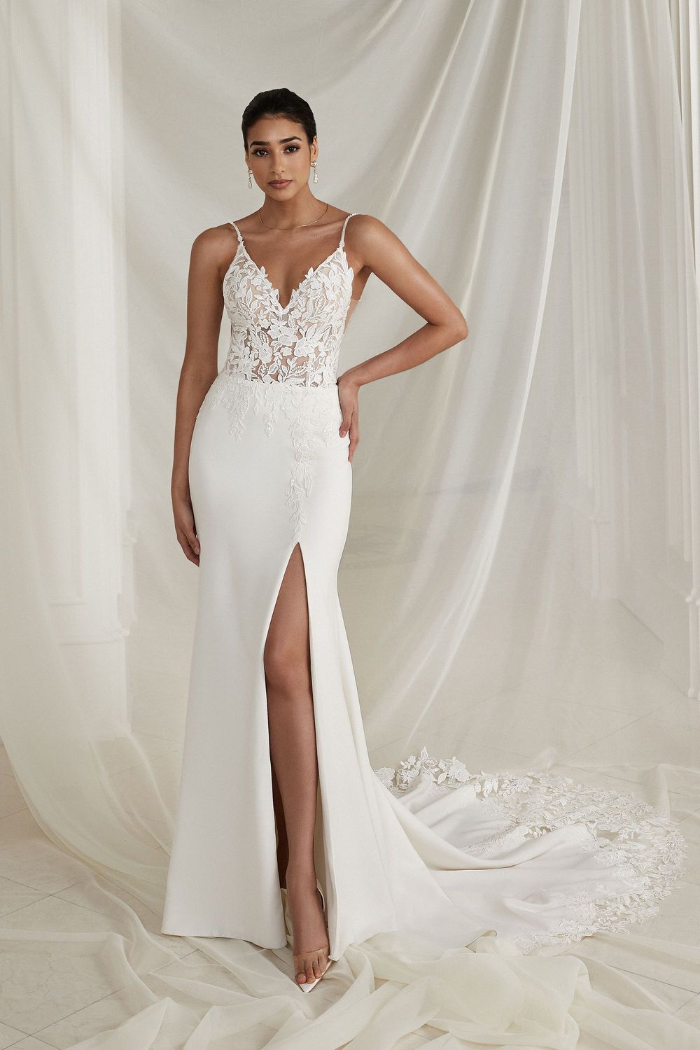 Een sexy jurk die jou fantastisch zal staan! De fit & flare pasvorm omarmen jouw rondingen op de juiste plaatsen. De kanten applicaties van het lijfje lopen door tot de loopsplit. Als finishing touch lopen vanuit de lage rug bedekte knopen tot de sleep, welke omringt is door het mooiste kant. Met de gewaagde loopsplit steel jij de show op jouw bruiloft in een kasteel, bos, tuin of op het strand!