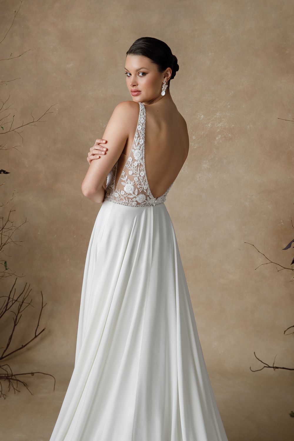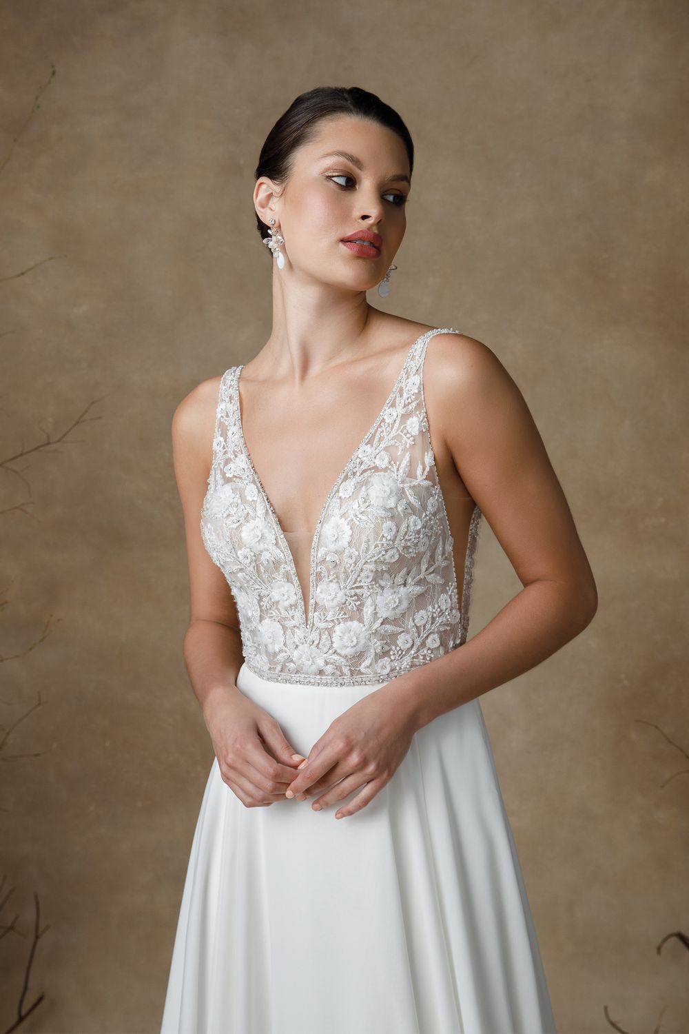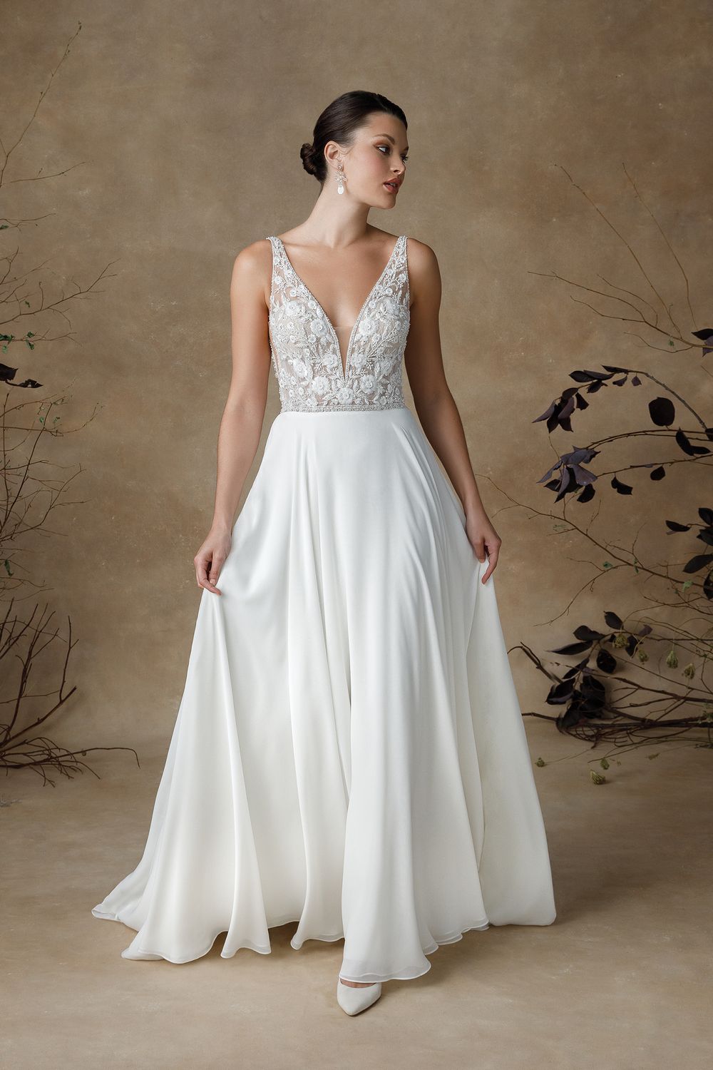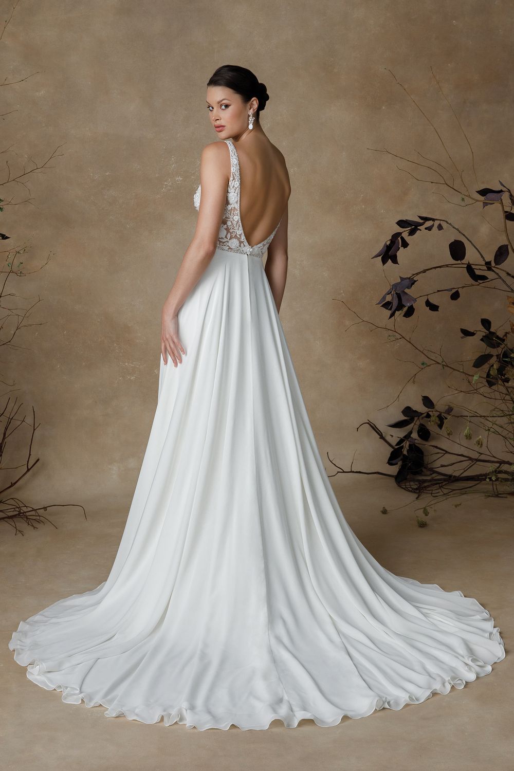 Deze mooie trouwjurk van Justin Alexander is de perfecte keuze voor je trouwdag. Het aansluitende bovenlijfje heeft kanten applicaties en een lage V-hals die zorgt voor een intieme en toch verfijnde uitstraling. De transparante zijuitsparingen van mesh en een tule rok met een sleep zorgen voor extra glamour op jouw speciale dag! Perfect voor een trouwdag op het strand of op een prachtig landgoed.
