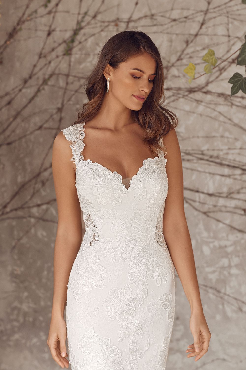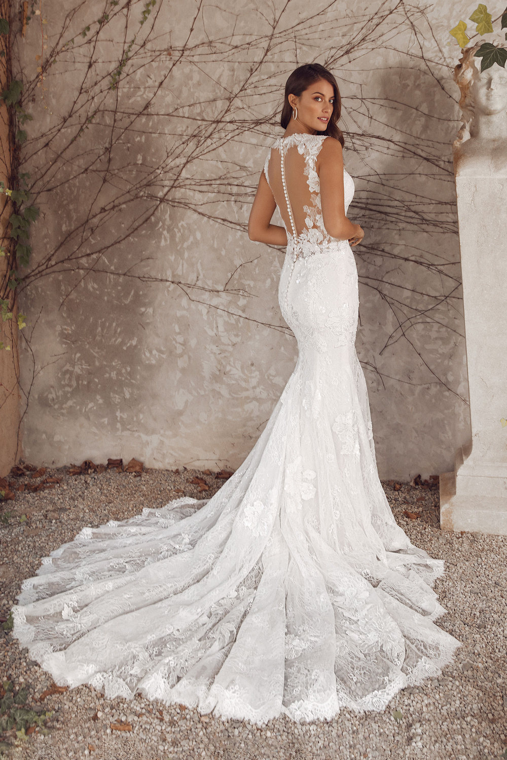 Fit & Flare deze trouwjurk uit de collectie van Justin Alexander. Deze jurk is geheel van apart kant en heeft een prachtige doorschijnende kanten sleep. Het lijfje heeft een sweetheart en kanten schouderbanden die doorlopen naar een illusie rug bewerkt met prachtige kanten applicaties. Een sexy detail zijn de illusie zijkanten van het lijfje.