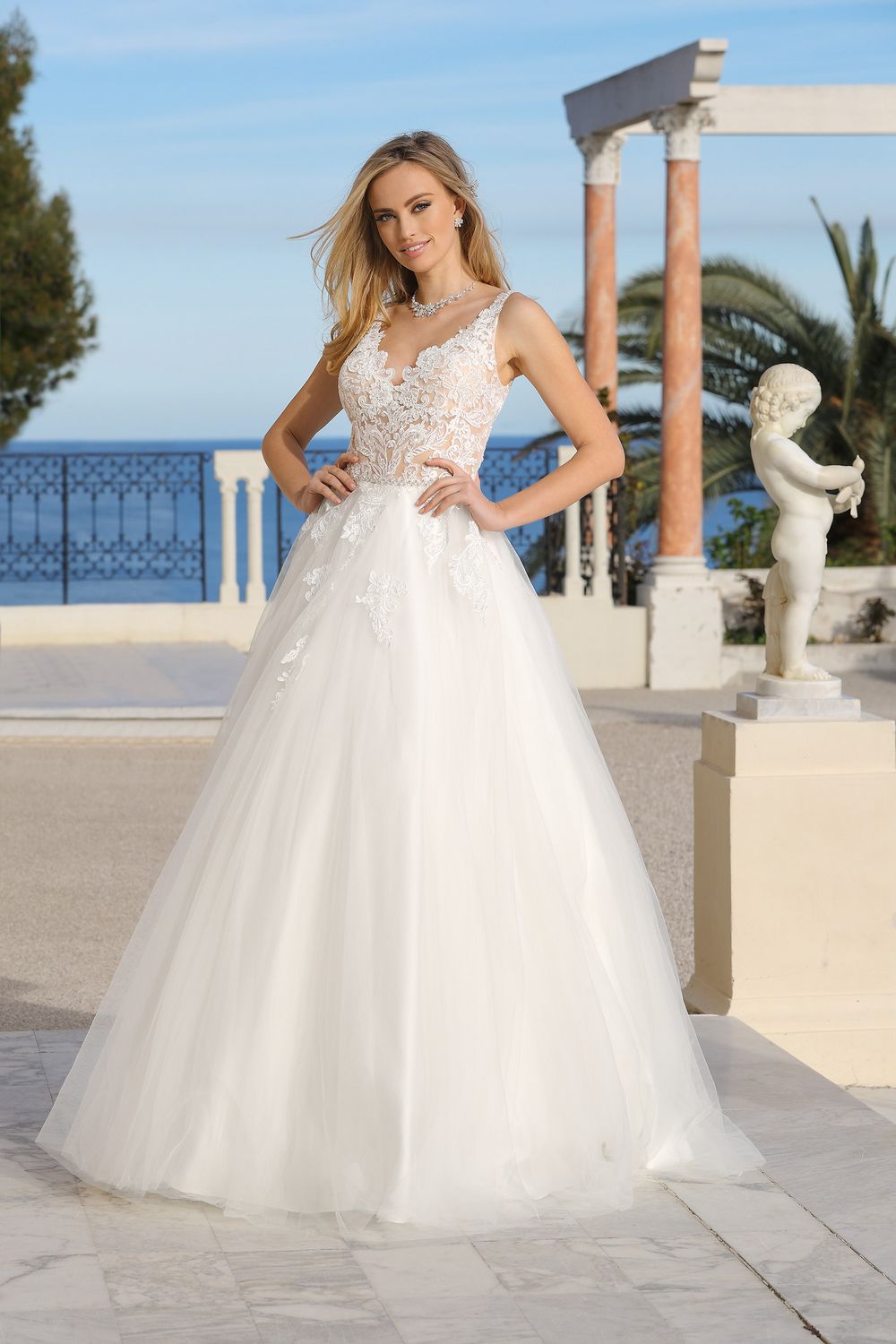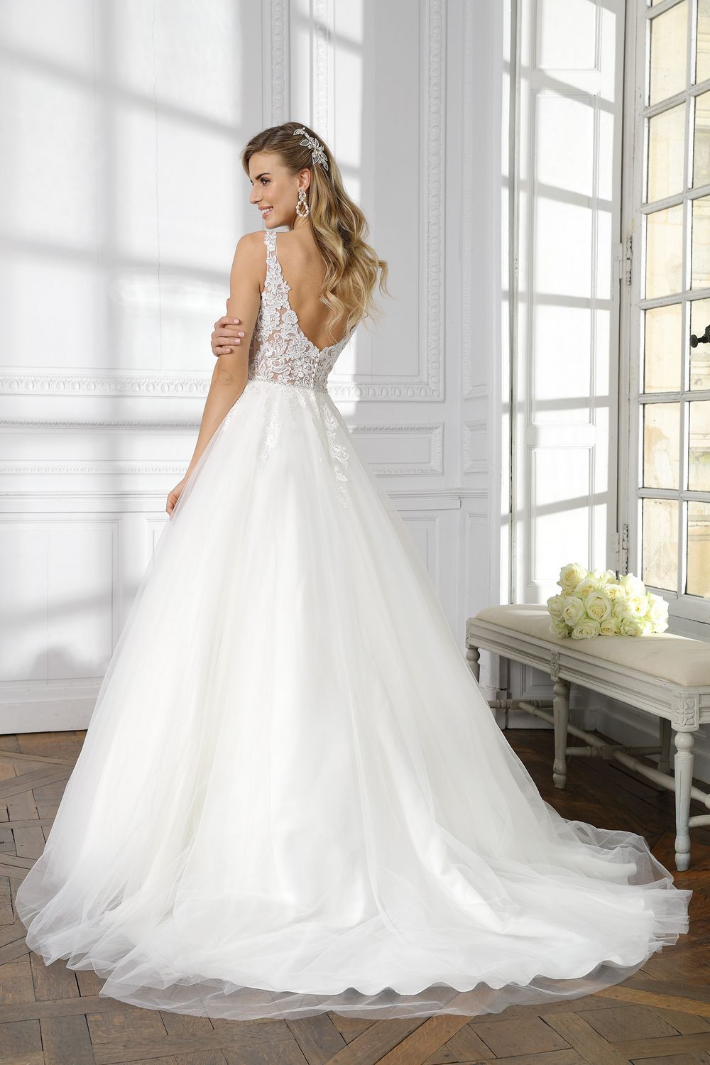 Deze prachtige jurk van Ladybird is een echte romantische jurk met een ballgown silhouet. Het lijfje is van kant en een beetje doorschijnend. De bruidsjurk heeft een verhoogde taille en onder de taillelijn lopen de applicaties nog iets door op de prachtige tule rok. Zowel de kanten halslijn als de kanten rug hebben een diepe V.
