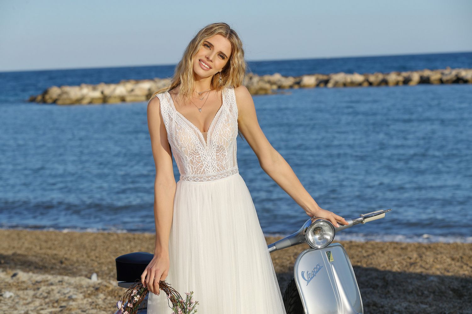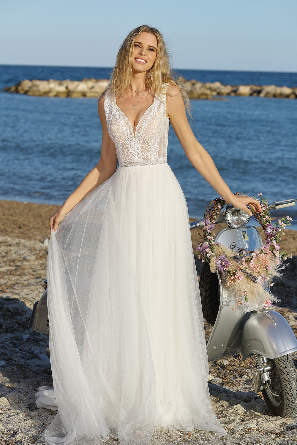 Fit&Flare vallende trouwjurk van Ladybird met een transparant lijfje met prachtig kant. Diepe V-hals en een diepe V-rug en een klein sleepje.