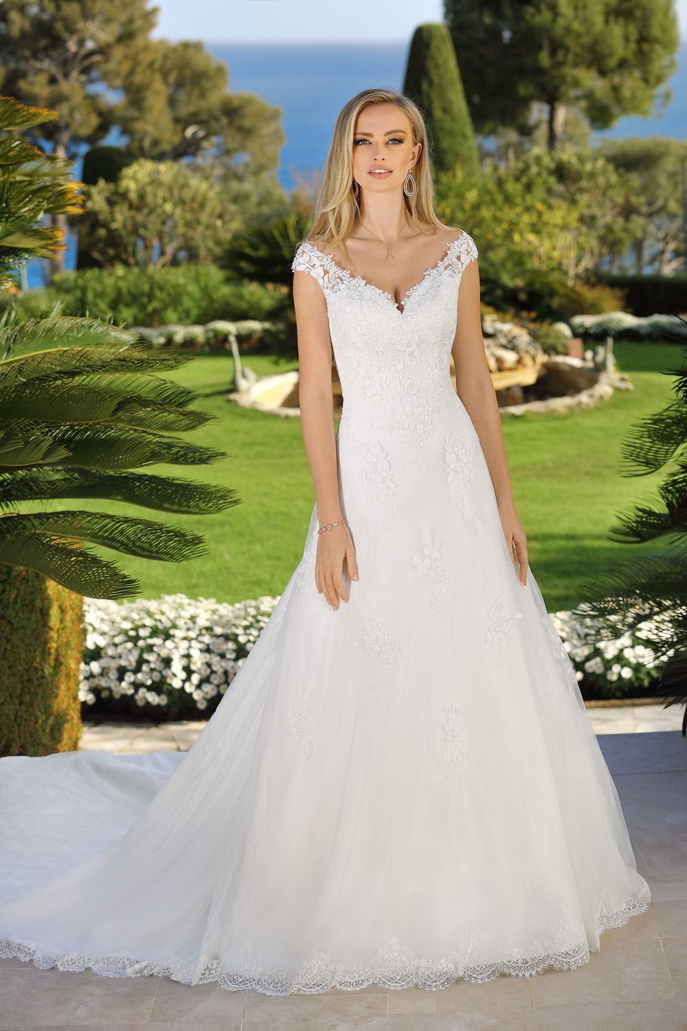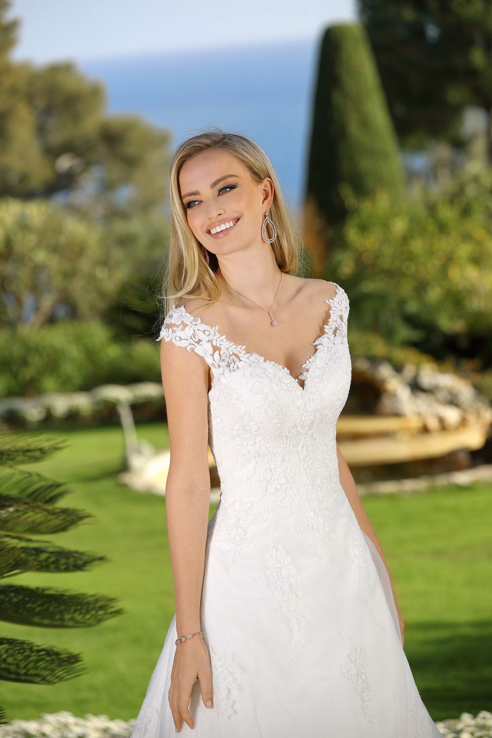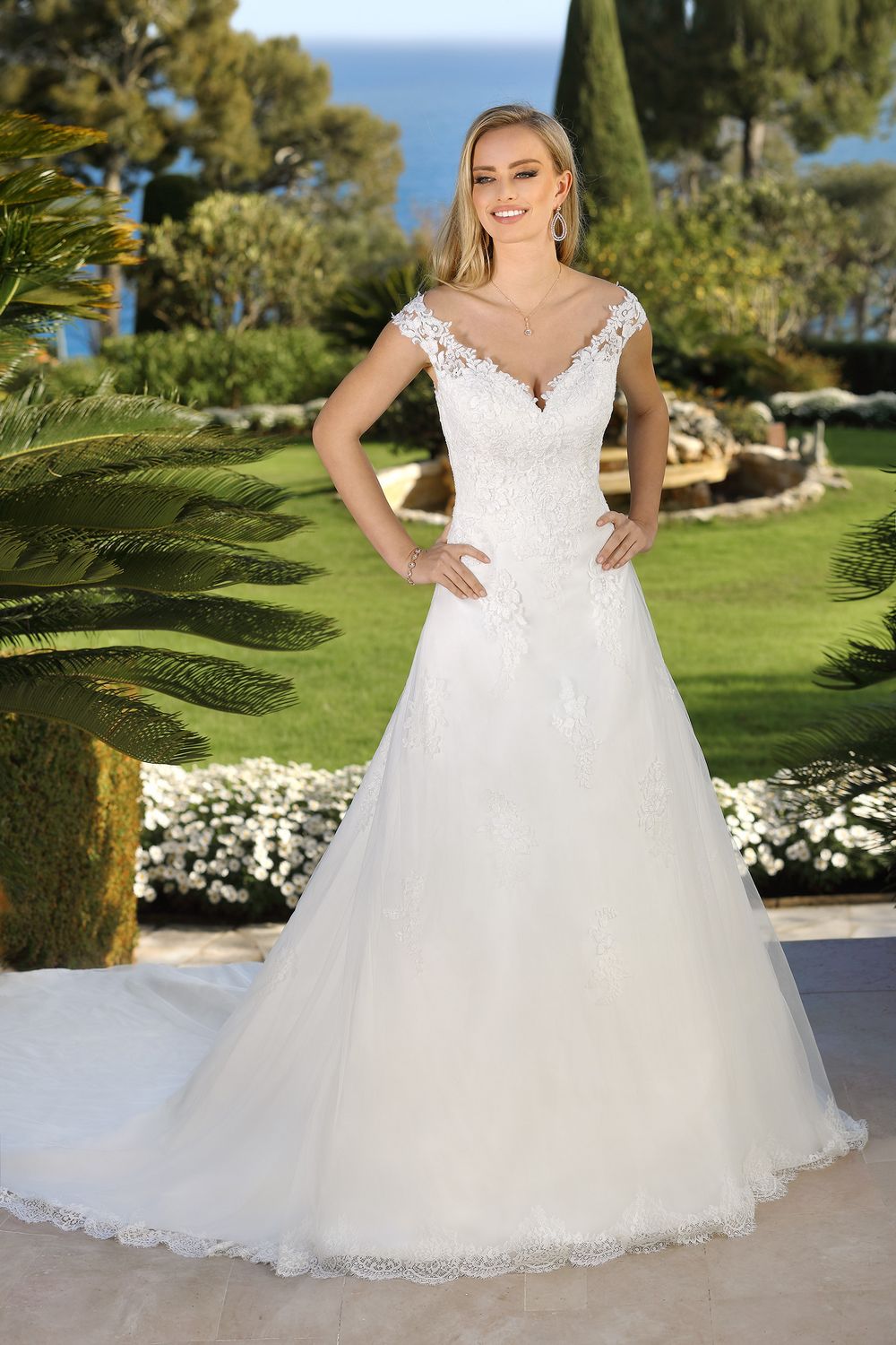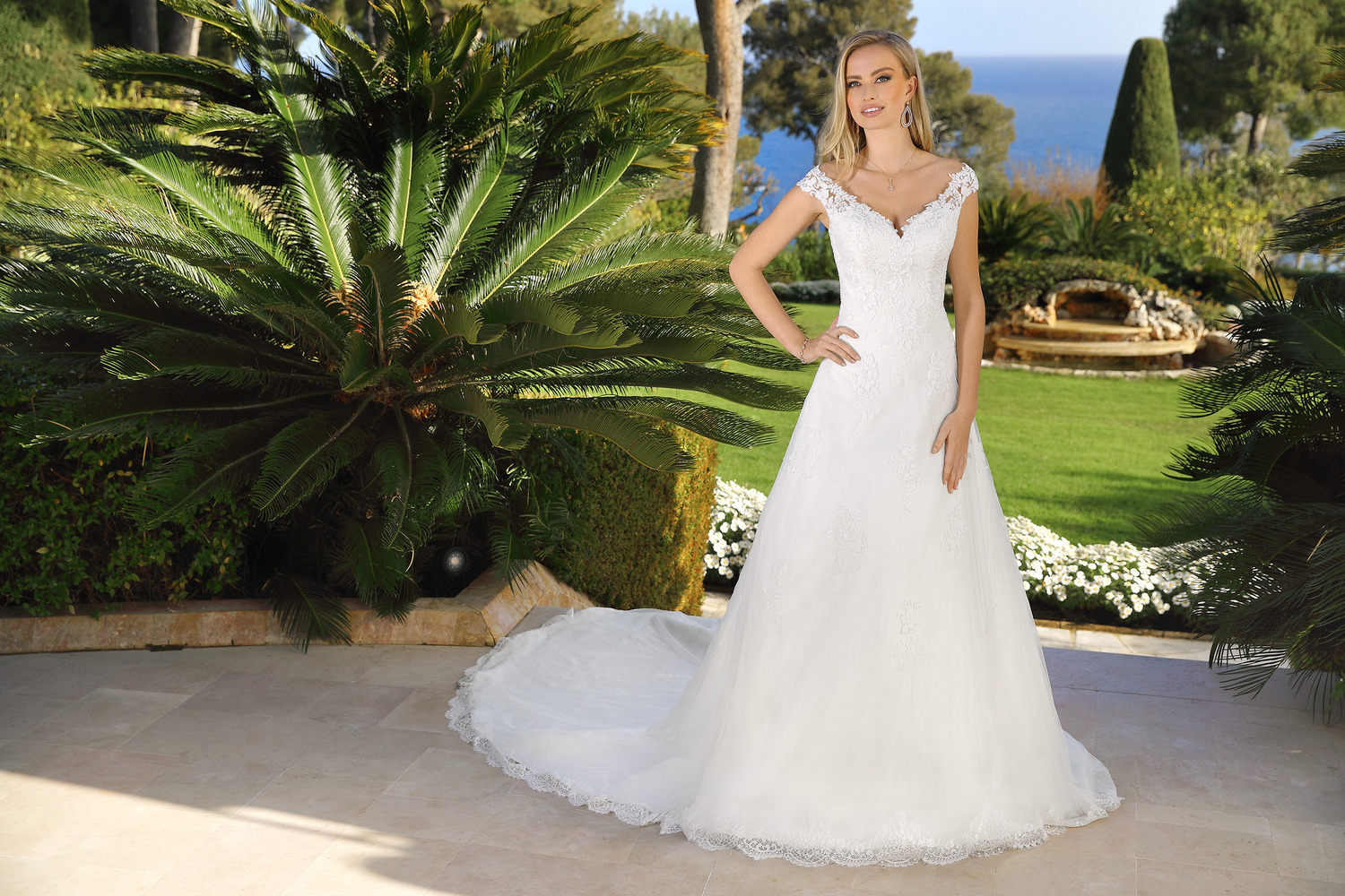 Een prachtige klassieke bruidsjurk van het merk Ladybird van tule en kant. De A-lijn jurk heeft een kanten lijfje en de kanten applicaties lopen vanaf de heuplijn speels verdeeld door op de mooie tule rok. De halslijn is iets off-shoulder en heeft een sweetheart.