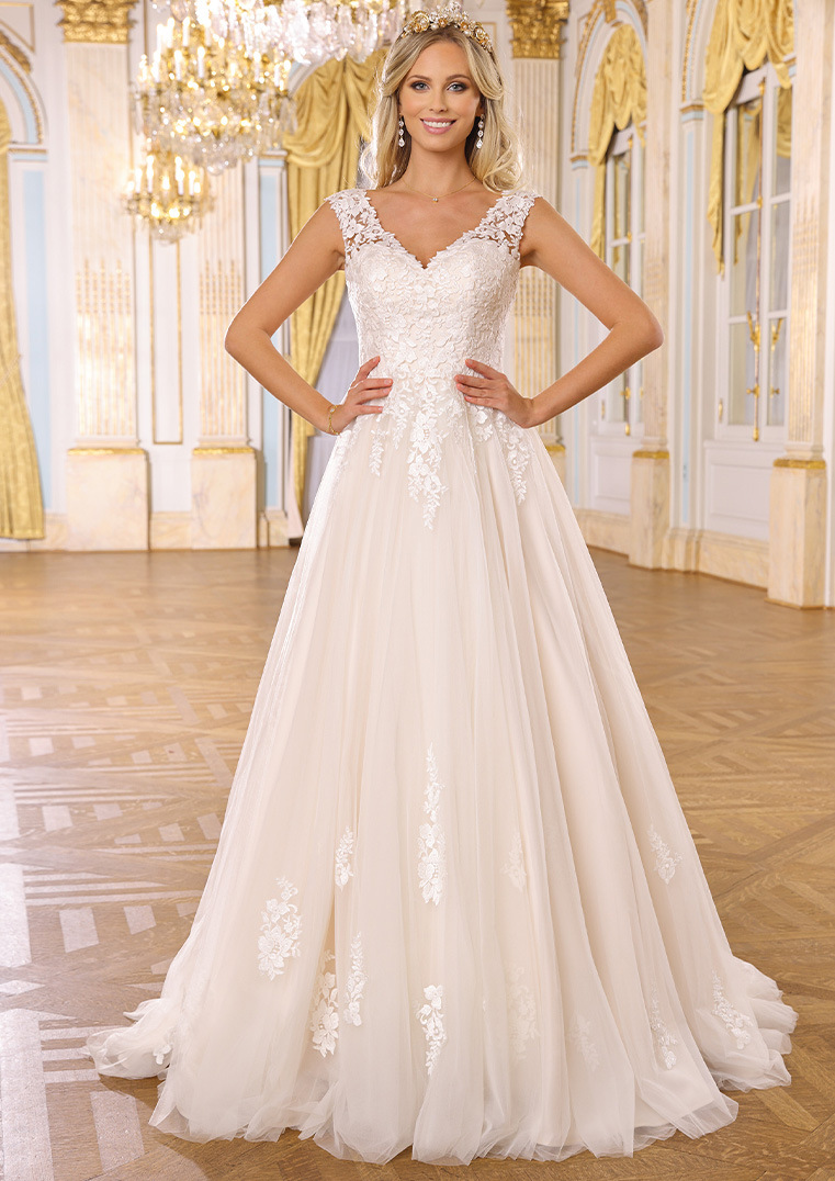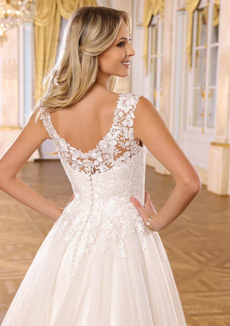 Stijlvol en klassiek, deze jurk van Ladybird is een A-lijn trouwjurk. De rok is gemaakt van tule in combinatie met kanten applicaties. Een hoge rug met knoopjes en een V-halslijn zorgen voor de perfecte combinatie voor jouw trouwjurk!
