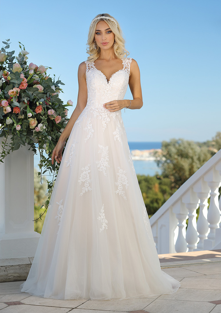Deze champagne kleurige trouwjurk heeft een charmante A-lijn silhouet met een sweetheart halslijn. Het wijd uitlopende model zorgt voor het perfecte model. De lage rug is heeft een illusion achterkant met kanten applicaties en geeft een magische uitstraling. Deze jurk is ook in het ivoor te bestellen en is ook verkrijgbaar in grote maten.