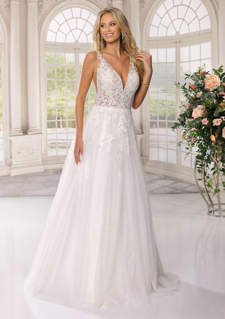 Deze sexy jurk van Ladybird heeft een A-lijn vorm met een transparant kanten lijfje. De V-halslijn en lage V-rugdecolleté vormen samen met de diep uitgesneden armsgaten een sexy uitstraling. De rok is gemaakt van tule, maar uniek door de glitterende details.