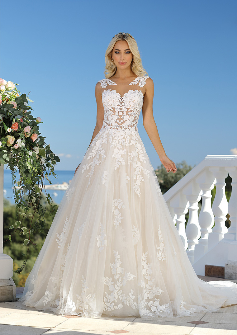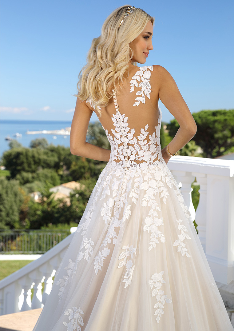Een uniek exemplaar dat een romantische en sexy bruids uitstraling heeft. Een volle tule rok in ivoor- en kokos kleur met kanten applicaties. Een illusion top met kantapplicaties dat ook doorloopt in de schouderbandjes. De achterkant heeft een bladeren patroon aan kanten details samen met een lange rij aan knoopjes.