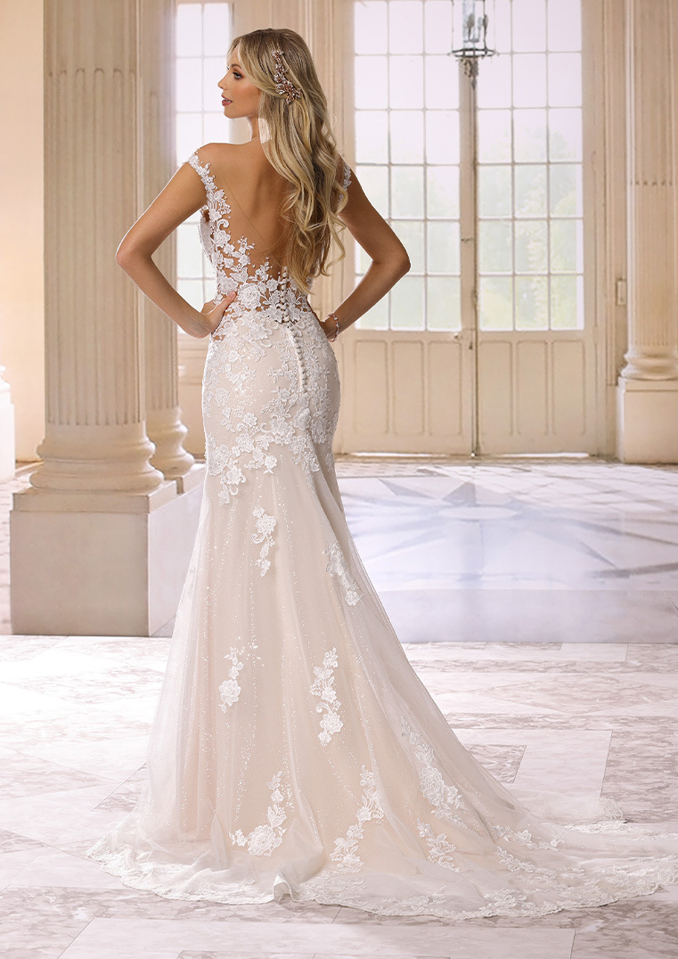 Het fit & flare model 422057 heeft een betoverende uitstraling met een glitter tule laag. Een diep uitgesneden V-halslijn voor een sexy en gedurfde look. Zijkanten die zijn uitgesneden voor een vrouwelijk silhouet. De droomachtige lage rug met illusion kanten applicaties die doorlopen over de billen, kortom adembenemend!