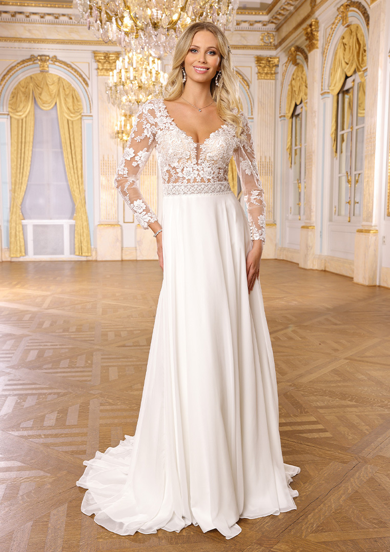 Yes! Jullie gaan trouwen op het strand! Daar hoort een romantische lichte bruidsjurk natuurlijk bij! De 522023 heeft een luchtige rok gemaakt van chiffon dat een romantische flow geeft. De top is bewerkt met prachtig bloemen kant en een diepe sexy V-halslijn. De lange mouwen zijn ook voorzien van prachtige applicaties. De achterkant is diep uitgesneden voor de ultieme sexy touch voor een strandbruiloft!