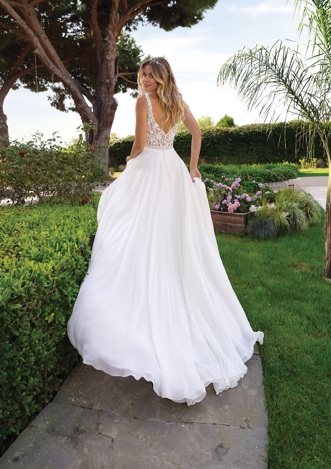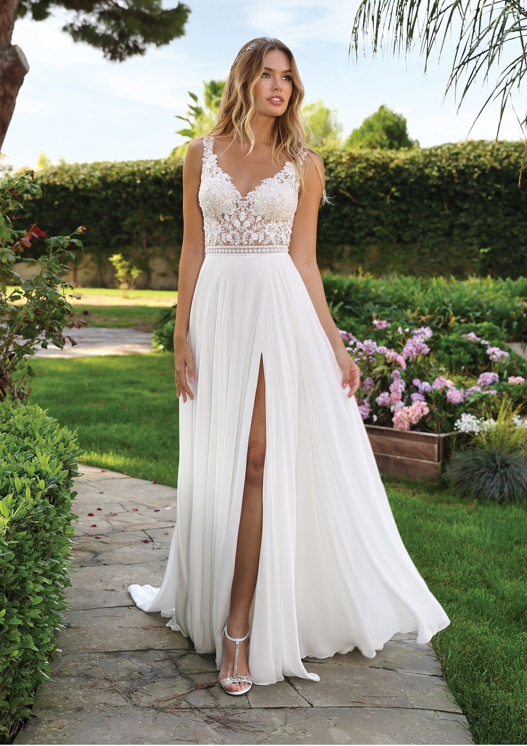 De Annabell uit de Ladybird collectie is een mooie, luchtige trouwjurk. Het see through lijfje is bedekt met kanten applicaties waarop glinsteringen zijn toegevoegd. Het bandje onder aan de top accentueert je taille en de A-lijn rok zorgt voor een romantische uitstraling. De loopsplit geeft deze romantische jurk een sexy boost.