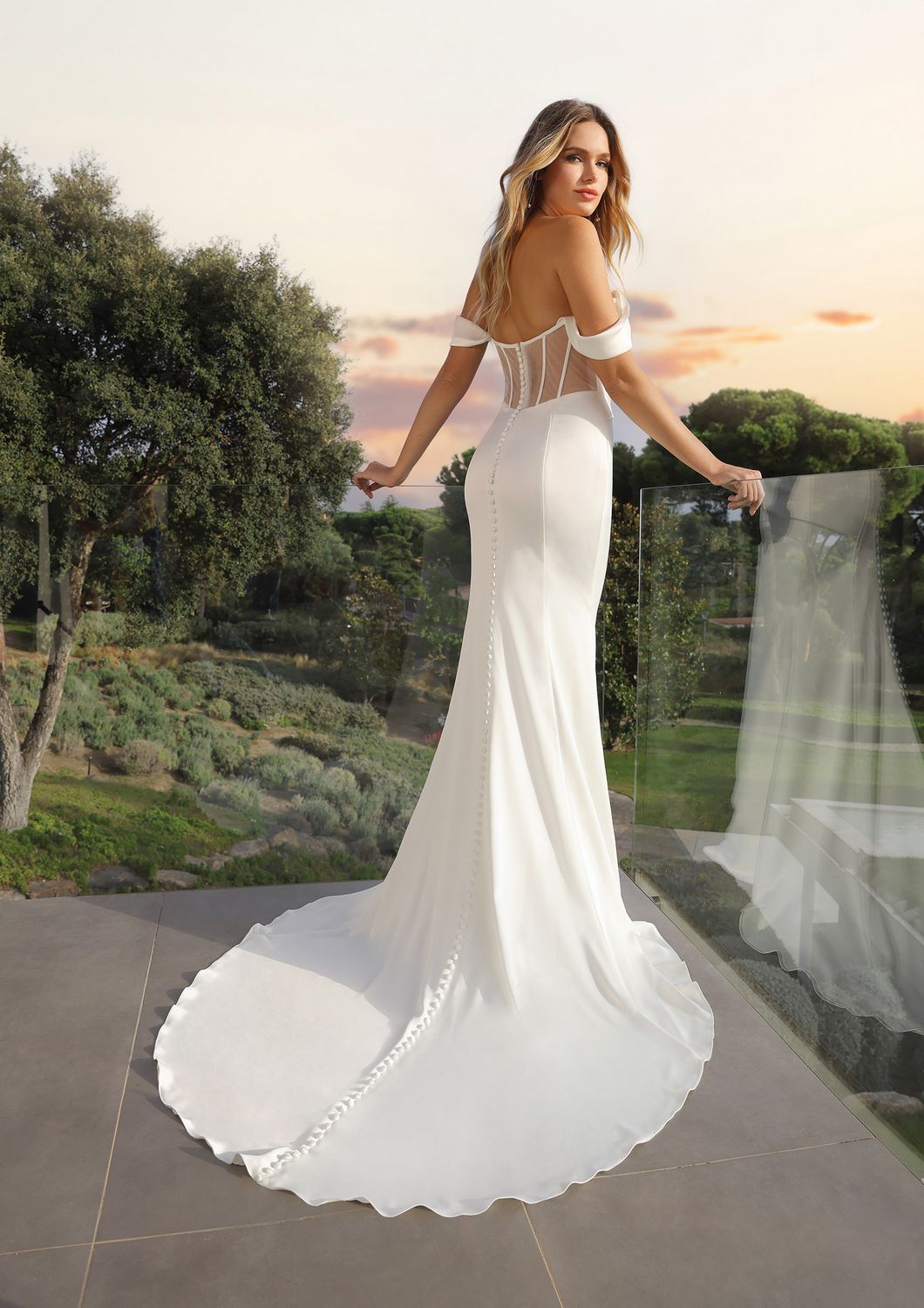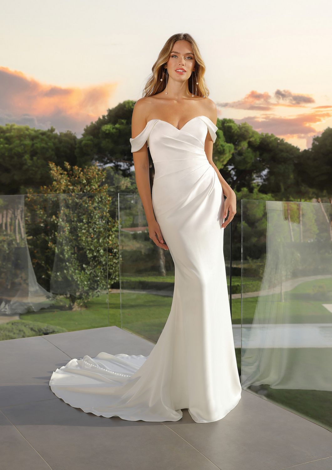 Deze waanzinnige fit and flare jurk omarmt jouw lichaam! De Areanna jurk heeft een sexy sweetheart halslijn en flirterige off-shoulder bandjes. Je taille wordt extra geaccentueerd door de plooien in de jurk. Deze klassieke maar moderne jurk is afgewerkt met knoopjes die van boven tot aan onder de sleep bevestigd zijn. Een prachtige jurk voor een bruiloft op bijvoorbeeld een landgoed of het strand.