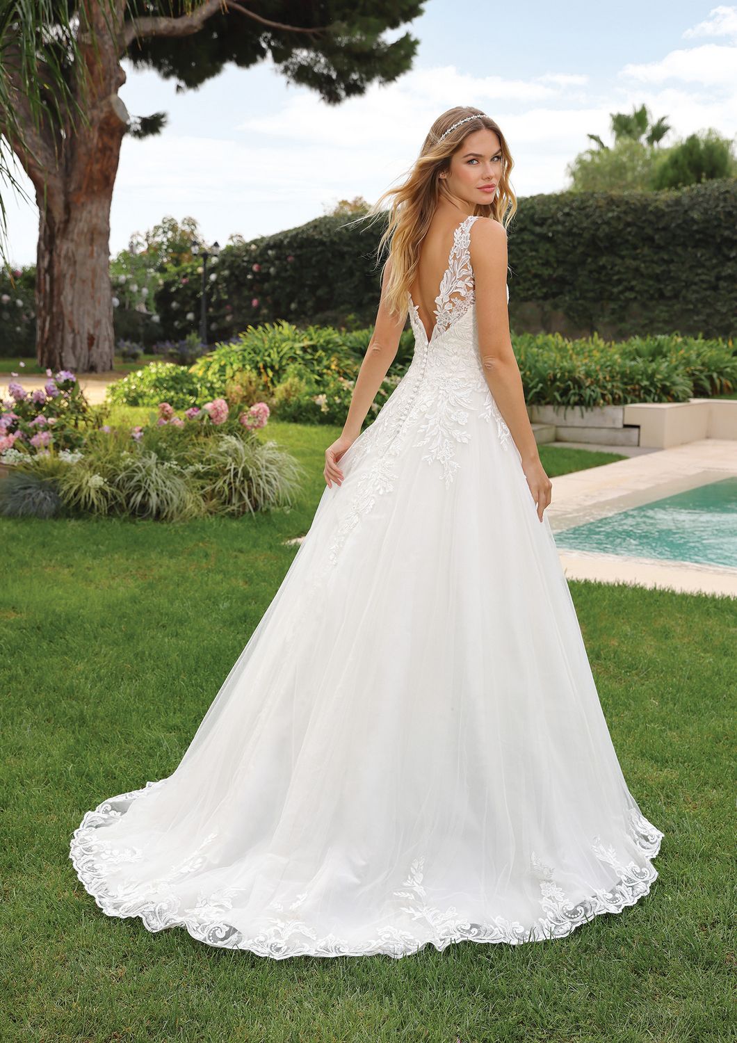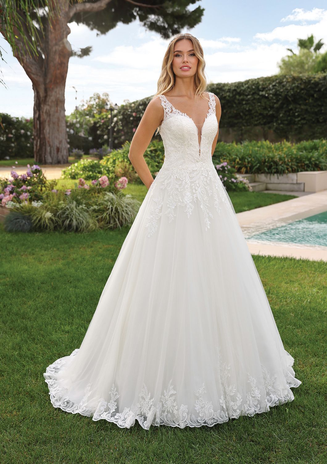 Dit klassieke A-lijn model is de Eros van Ladybird. De diepe maar subtiele V-hals is afgewerkt met kanten applicaties die overlopen in de A-lijn rok. De kanten schouderbandjes lopen door naar de open rug. De zoom van de rok is afgewerkt met een randkant voor de romantische look!