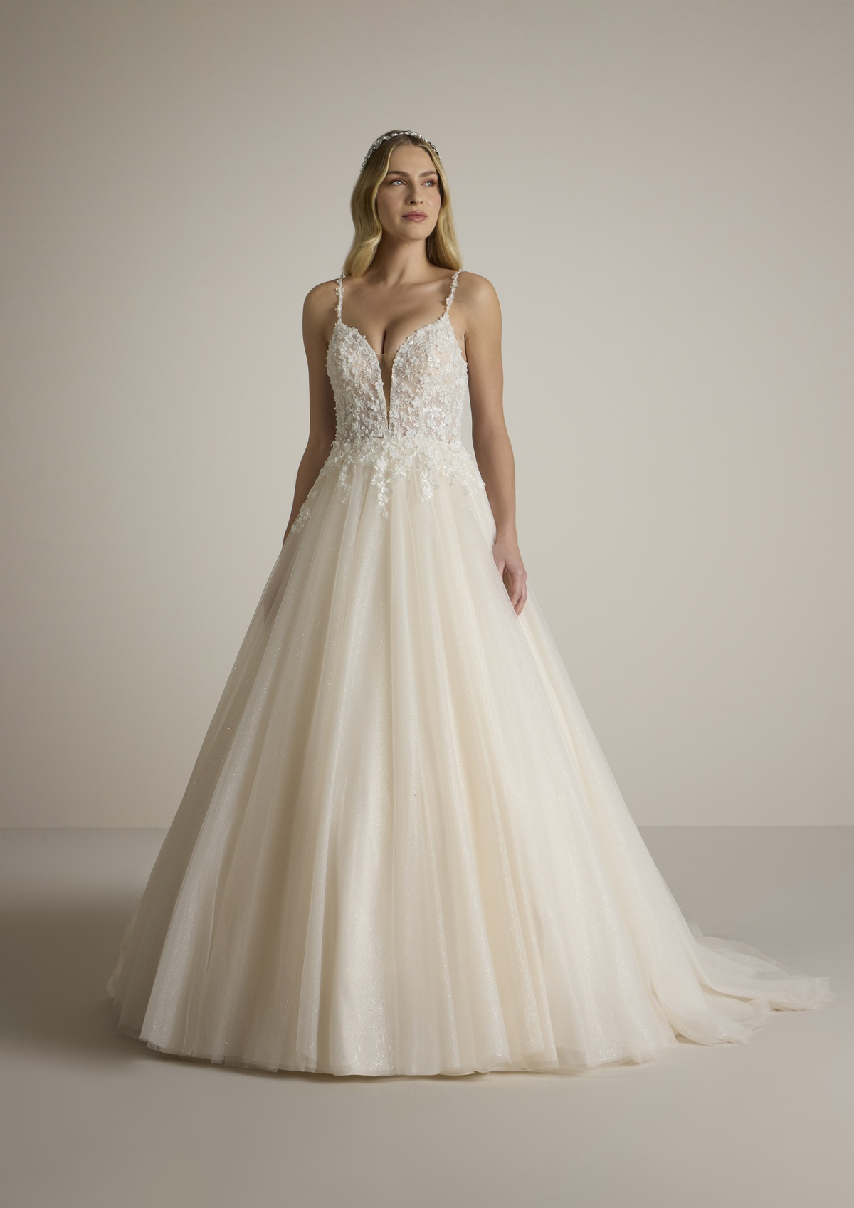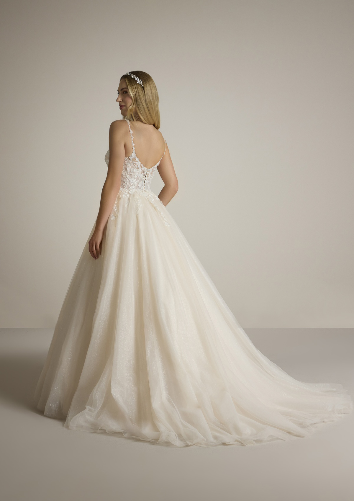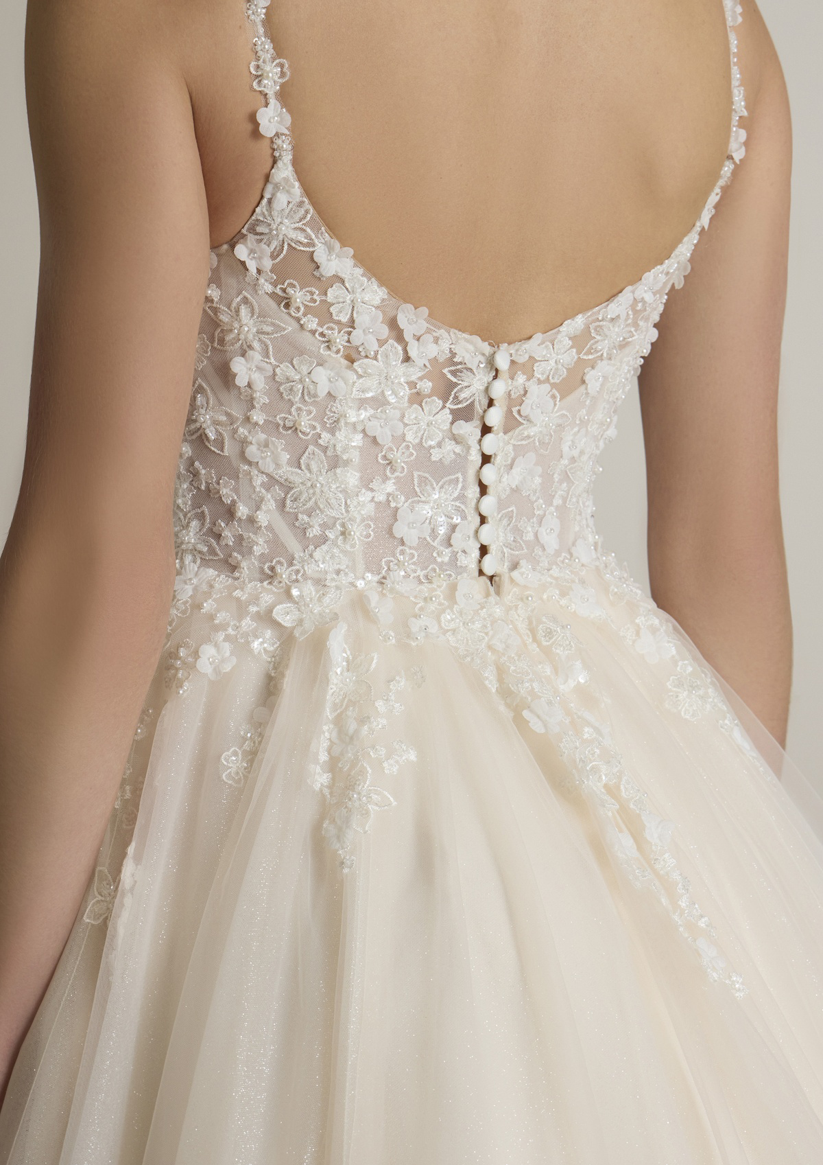 Laat je betoveren door deze lange jurk met geborduurd kanten lijfje en kraaldetails en 3D bloemetjes. De juwelenbandjes lopen langs een sensuele V-halslijn. Het A-lijn silhouet laat je figuur beter uitkomen en de rok schittert met door de glittertule die erin verwerkt zit.