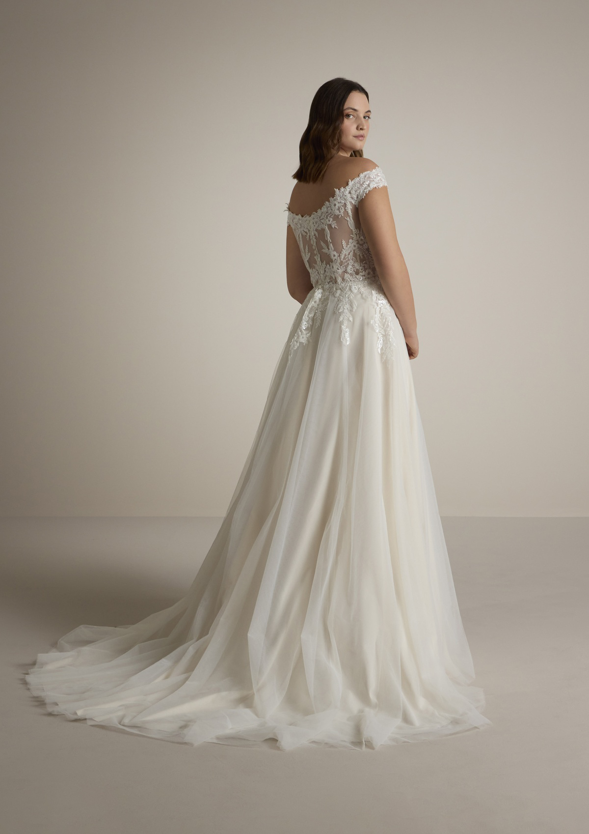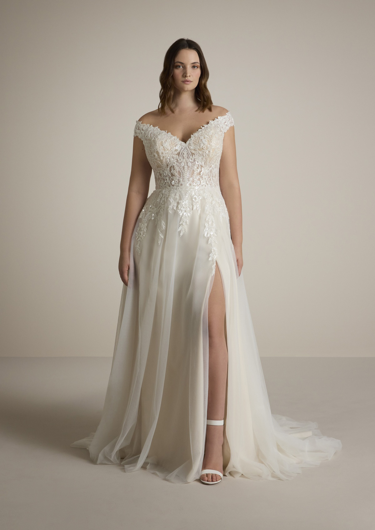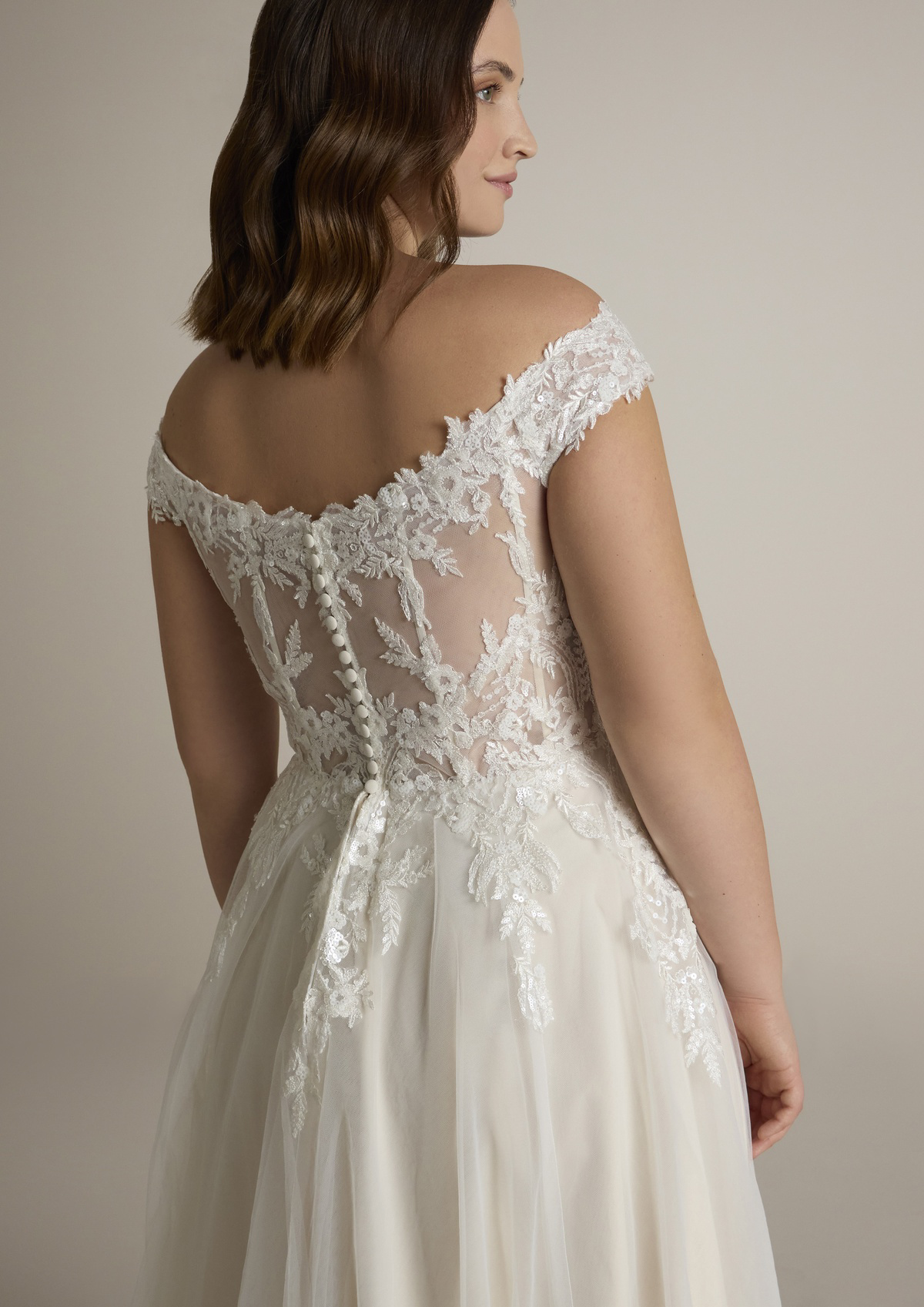 Deze jurk geeft door de eenvoud van de tule rok alle aandacht aan het lijfje en is ideaal voor bruiden die een vleugje glamour willen. Met een overslagkraag valt het kanten borduursel op dankzij de kralenversieringen, die elegant over de taille vallen in een asymmetrische watervalvorm. De rok heeft een split aan de voorkant, die lichtheid en beweging toevoegt.