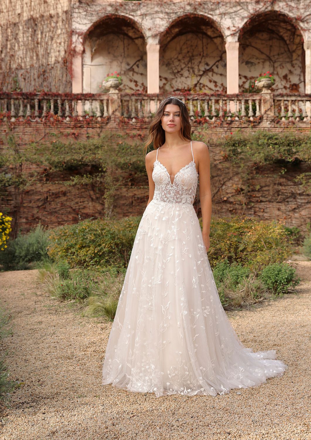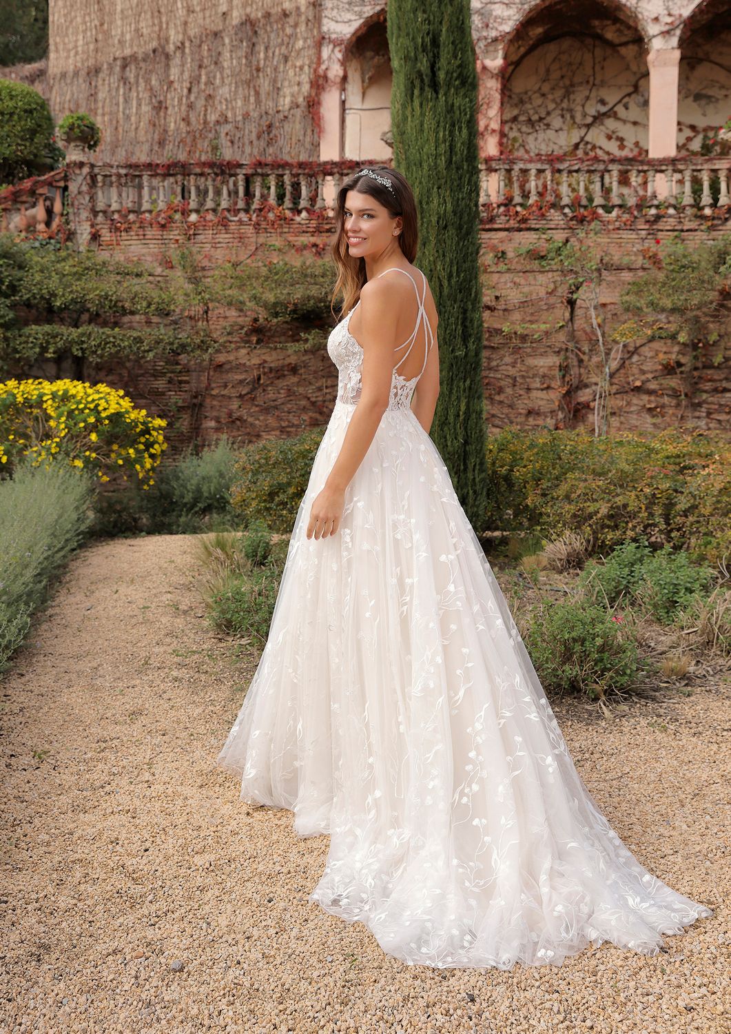 De trouwjurk Karla van Ladybird vangt de essentie van moderne romantiek in dit prachtige ontwerp. Met een verleidelijke V-hals, de prachtige rugbandjes en een A-lijn silhouet straalt deze jurk zowel verfijning als charme uit. Het bovenlijfje is voorzien van bijzondere botanische bloemenkant dat overloopt in subtielere kanten bloemetjes over de gehele rok. Een prachtige trouwjurk voor een bruiloft op het strand, in een tuin of op een landgoed!