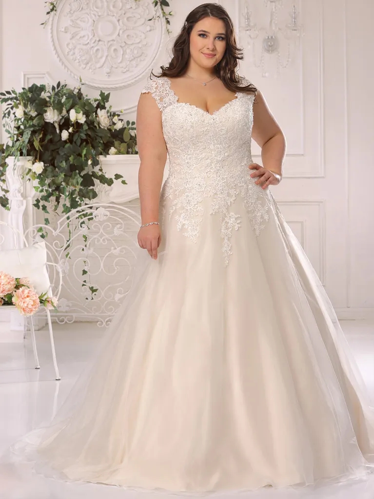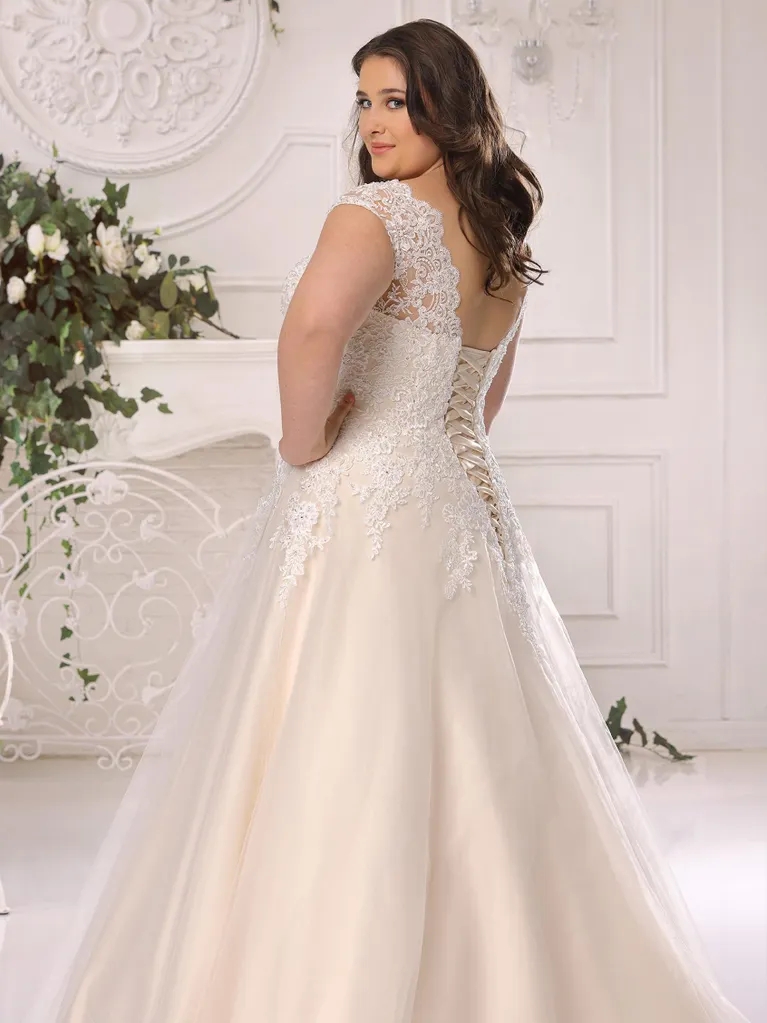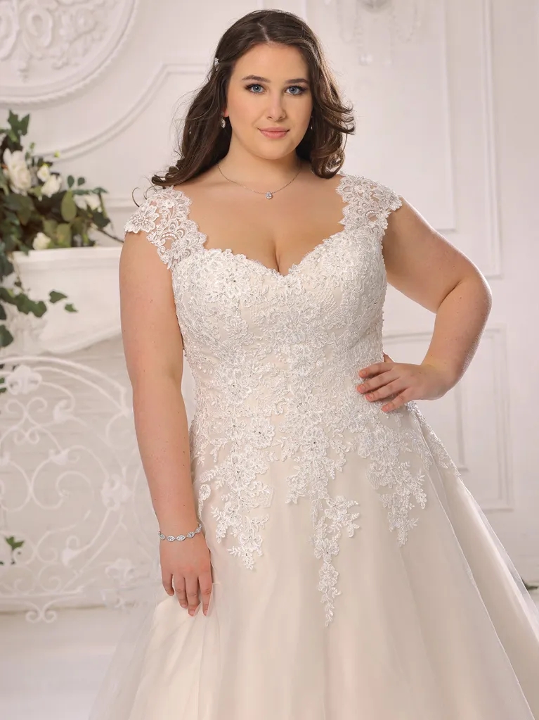 Wat een prachtige trouwjurk! Het prachtige kant loopt over de sweetheart halslijn, natuurlijke taille en de wijde rok. De schouderbandjes lopen net over je schouders waardoor ze iets offshoulder lijken. Op de rug zie je een stijlvolle vetersluiting die voor een weelderig effect zorgt.