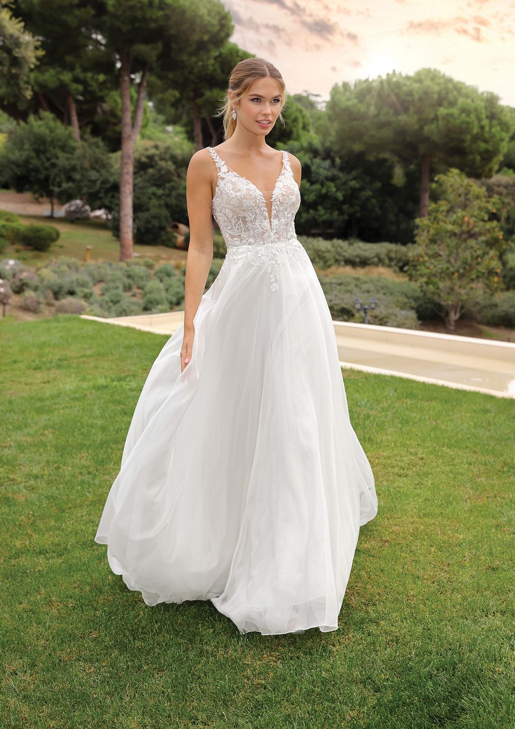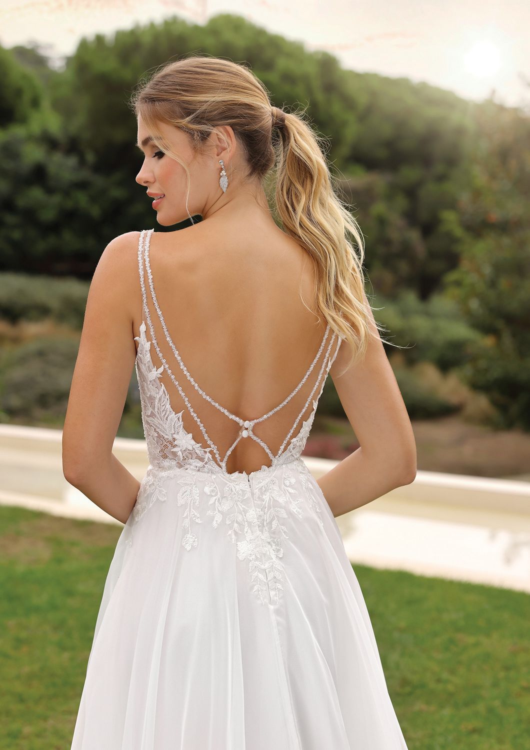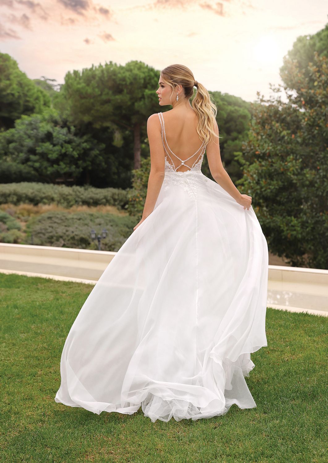 Ontdek de Mirabella, een verbluffende A-lijn jurk die je laat stralen. De jurk heeft een V-halslijn en gedetailleerde afwerking voor extra glamour. De schouderbandjes met glittersteentjes lopen door in elegante bandjes op de open rug. De rok is gemaakt van organza, een stof die prachtig vloeit met jouw bewegingen.