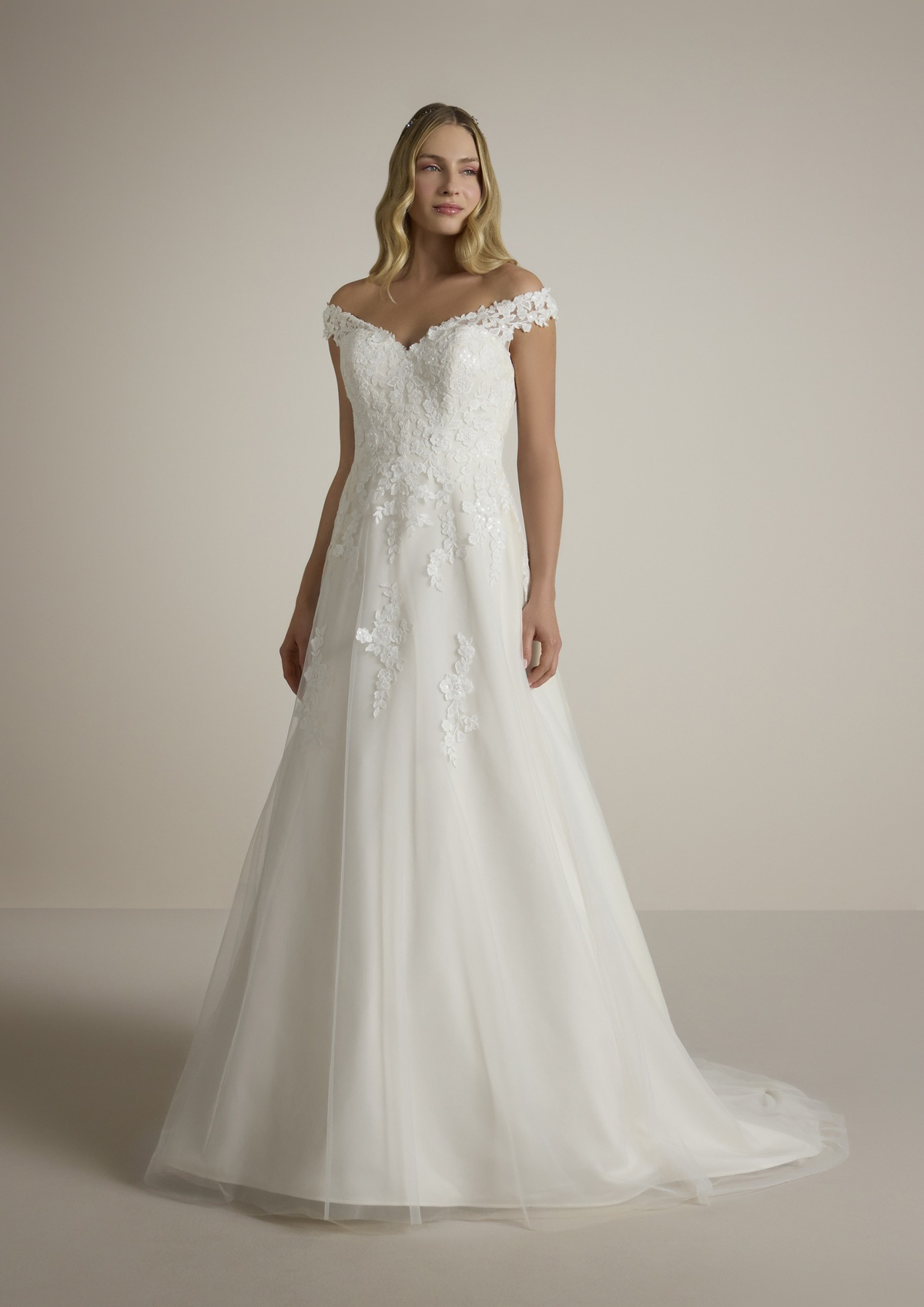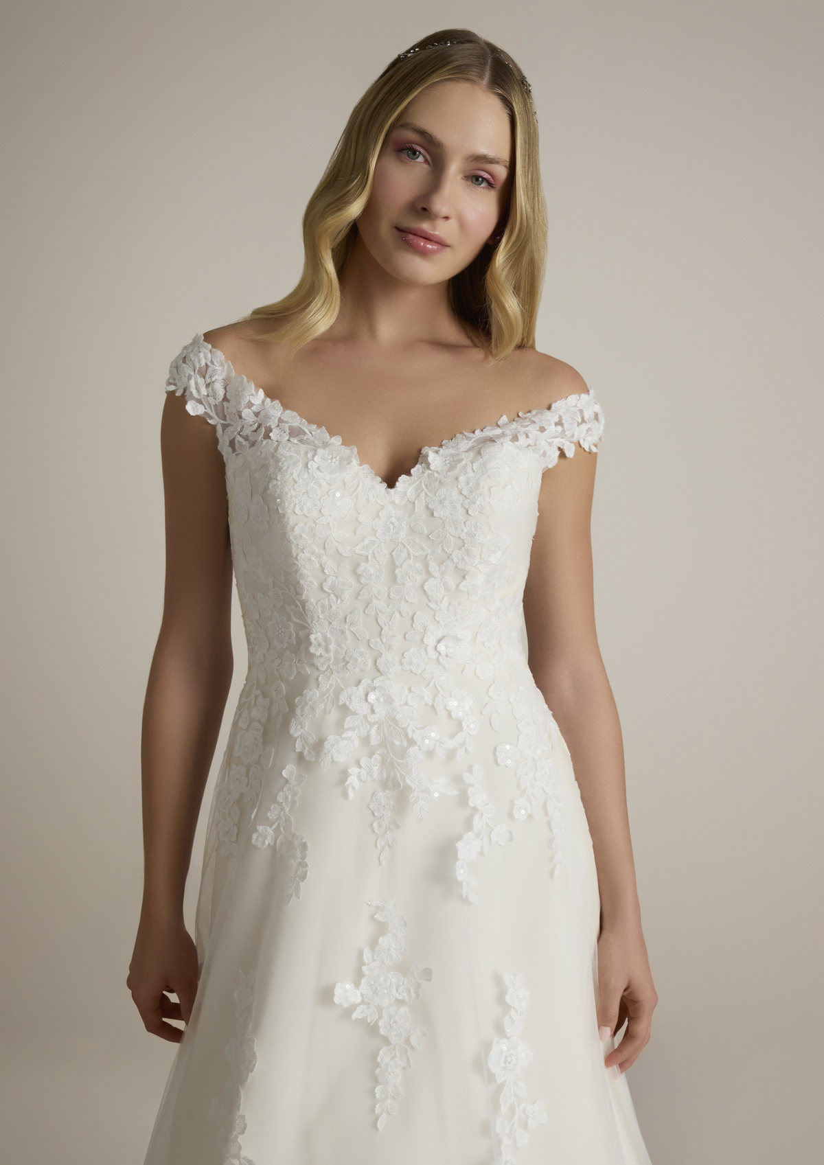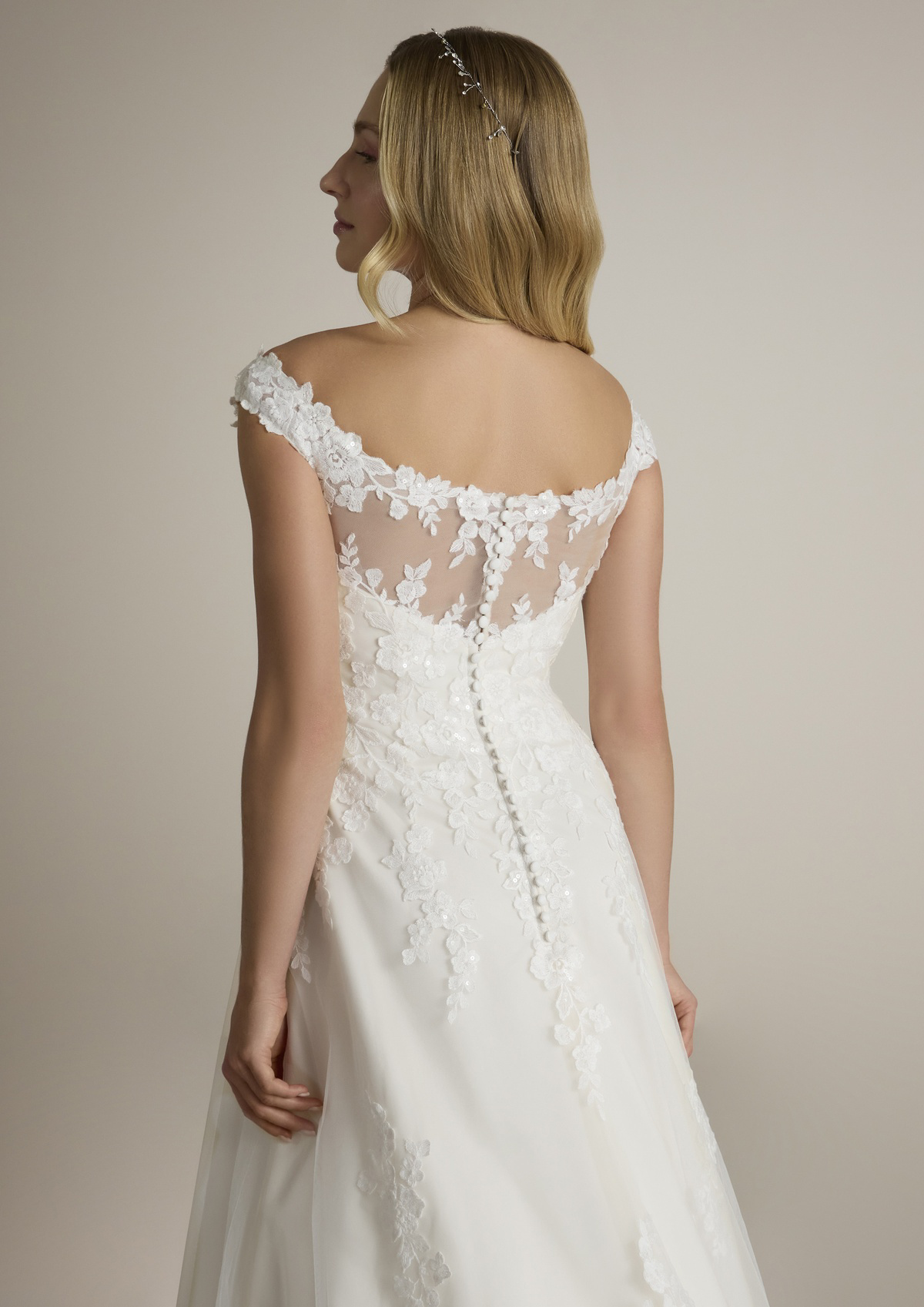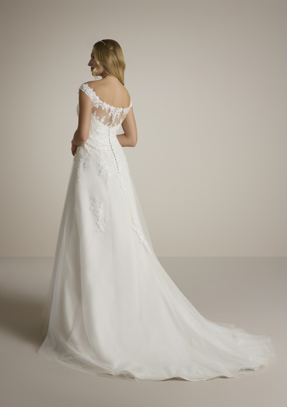 Kies voor deze tule jurk met een originele overslag. Het lijfje heeft geborduurde bloemen van kant met kralen er in verwerkt en een flatterende transparantie op de rug.