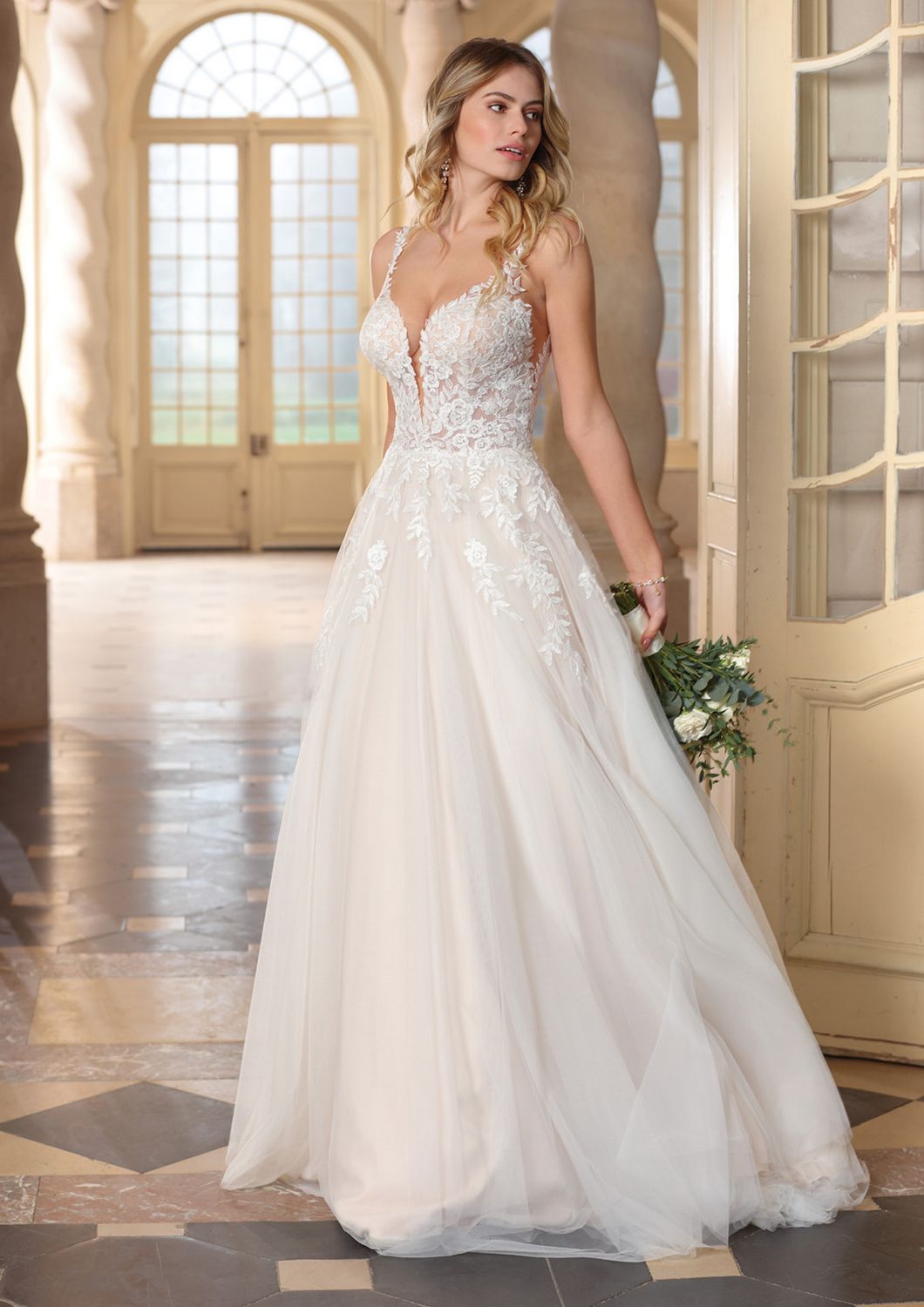 Deze trouwjurk van Ladybird is versierd met prachtige kanten applicaties die over de hele jurk aanwezig zijn. De luchtige A-lijn rok zwiert met je mee op de dansvloer! Het aangesloten lijfje benadrukt jouw taille en de V-hals geeft deze jurk een sexy touch.
