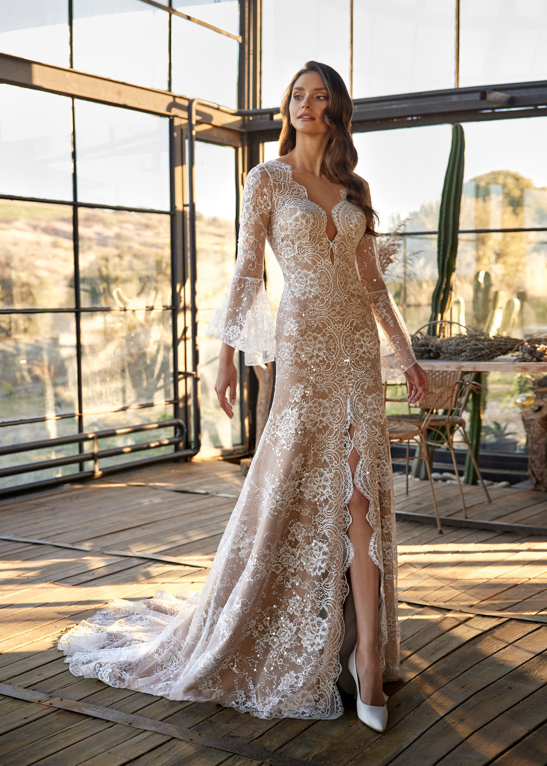 Fall in love met deze unieke all-over kanten jurk. Een subtiele glans in combinatie met een mokka ondertoon in de rok. Verder heeft deze unieke jurk een hoge split in het midden waardoor je mooie benen goed in uitkomen. De split is afgewerkt met kanten applicaties net zoals de rest van de jurk.