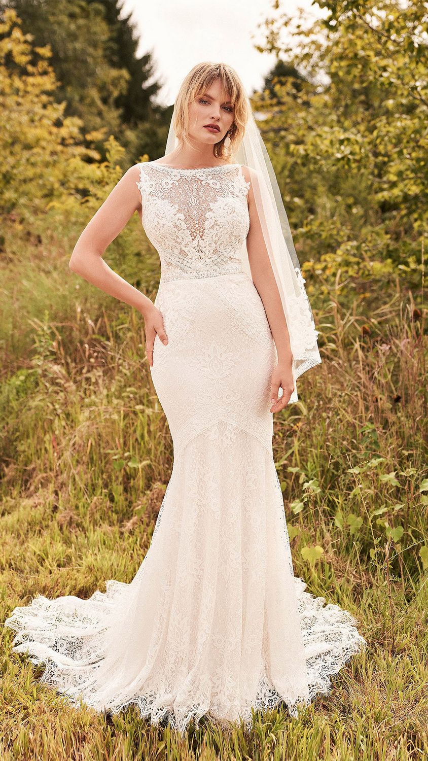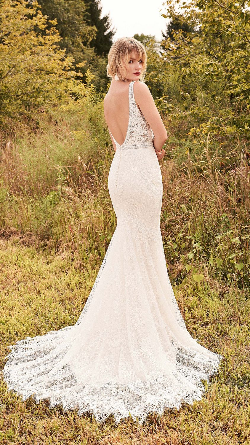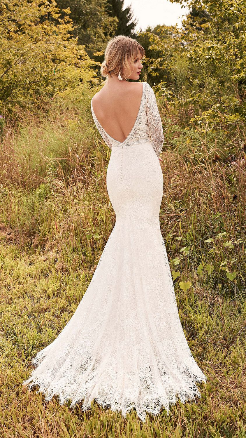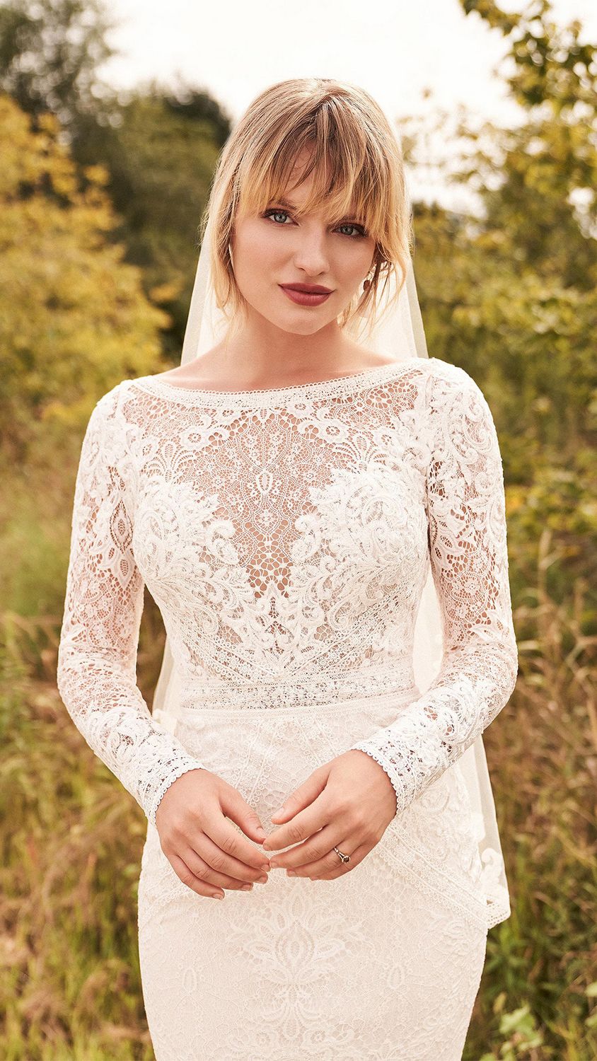 Deze all-over kanten trouwjurk met lage v-rug met een boothals heeft unieke uitneembare mouwen. Wil jij tijdens de ceremonie lange mouwen en 's avonds lekker kunnen feesten? Dan is dit de ideale combinatie!