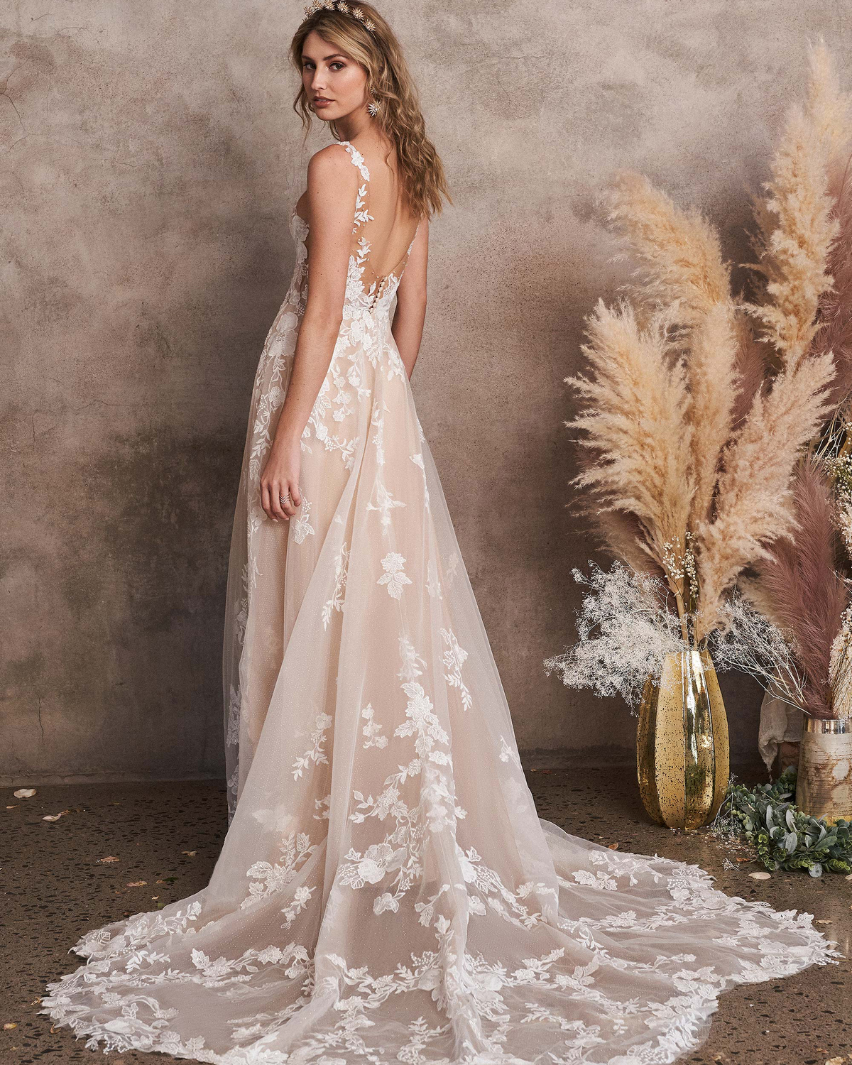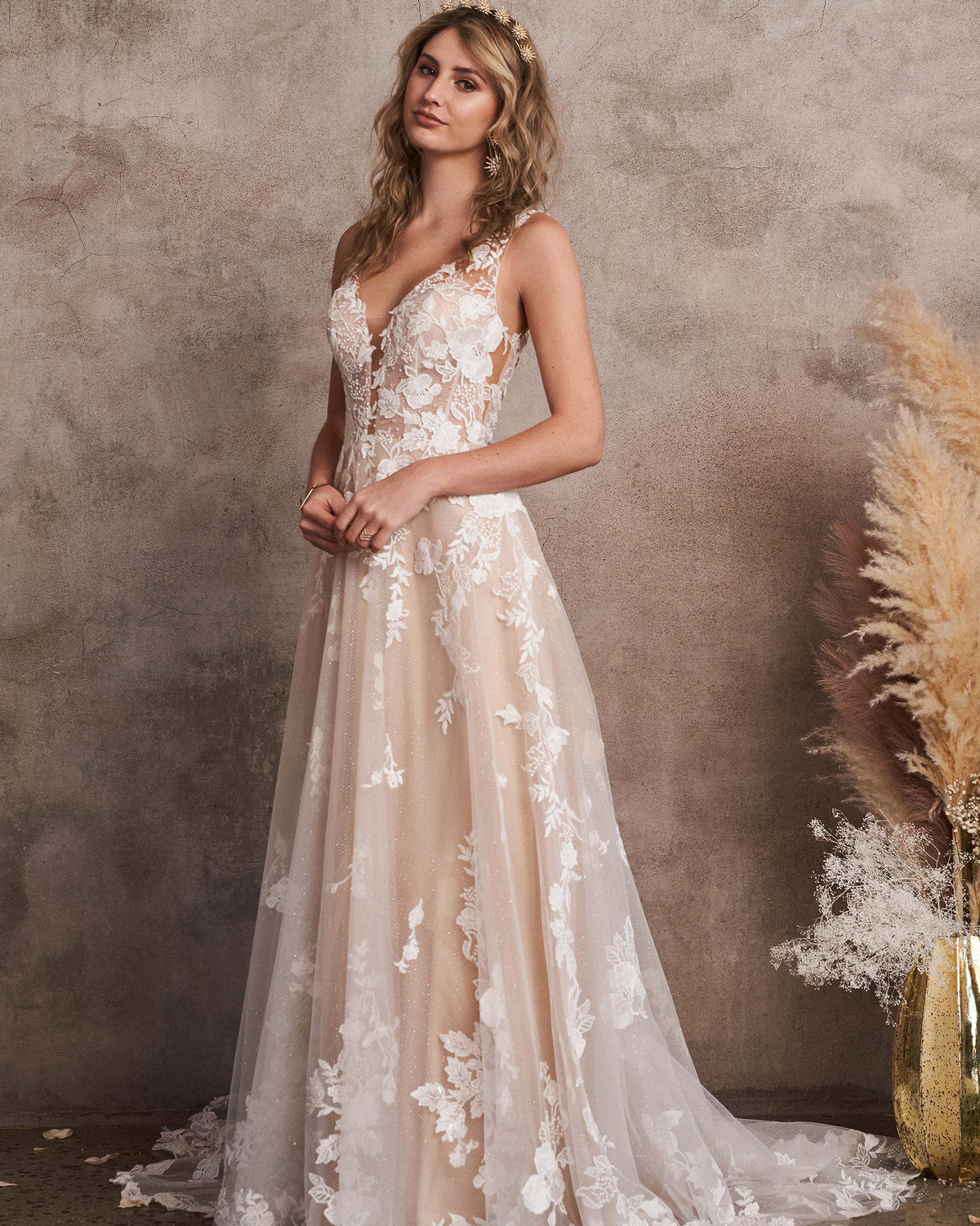 Dit prachtige exemplaar van Lillian West is uniek door de bladvormige applicaties. De kleur van de jurk zorgt samen met de ivoor kleurige applicaties voor een 3D effect. Door de diepe v-halslijn en illusion schouderbandjes is het een sexy jurk. Deze jurk heeft een glitter tule onderlaag.
