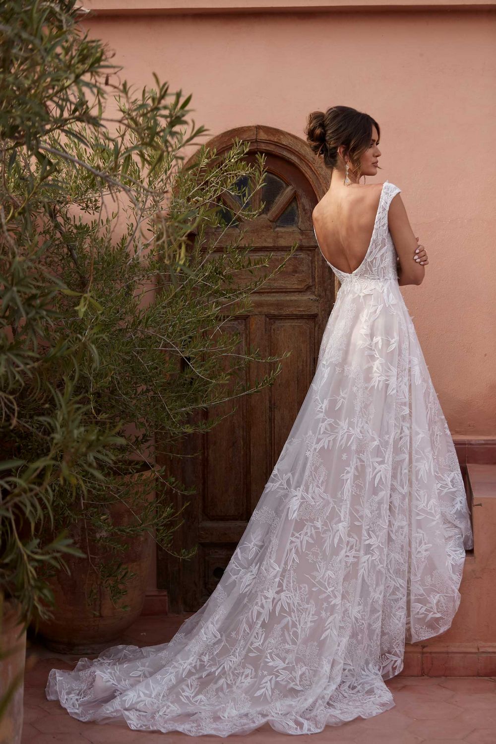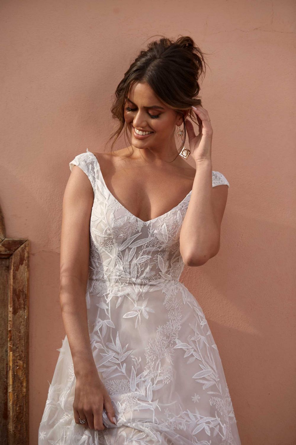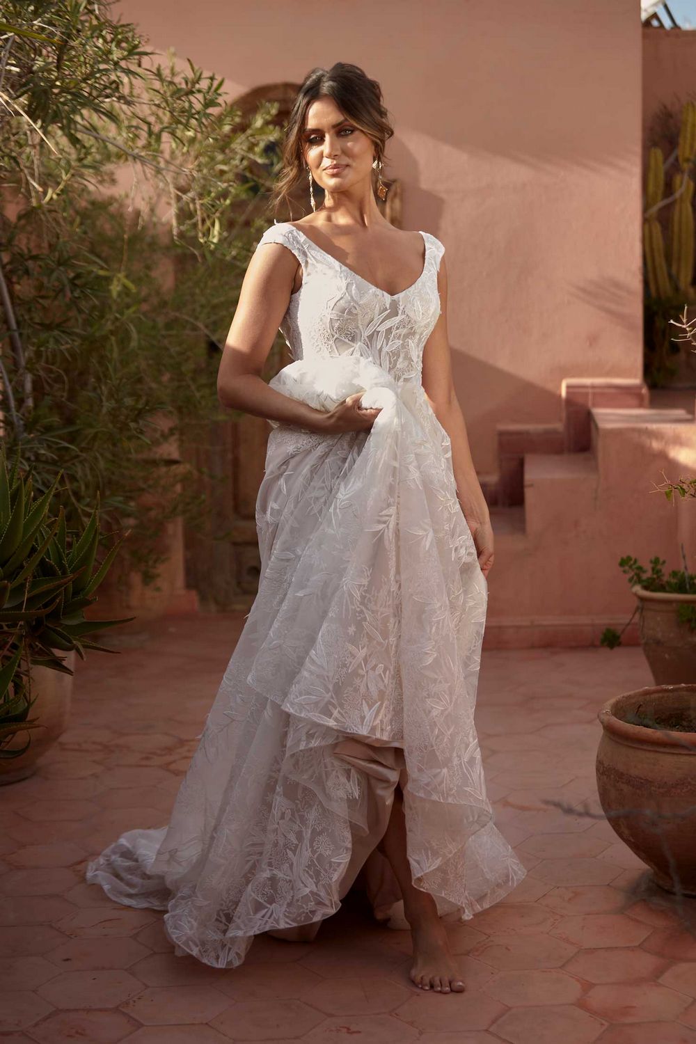 Model Aspen van ons nieuwe merk Madi Lane is een echte eyecatcher in de collectie. Het lijfje heeft een elegante halslijn met kleine kapmouwtjes en een hele diepe rug. De rok heeft een soepelvallende kanten laag over een poeder kleurige zijde voering.Hierdoor krijgt het geheel een extra romantische uitstraling. Dit model is ook in all ivory verkrijgbaar.