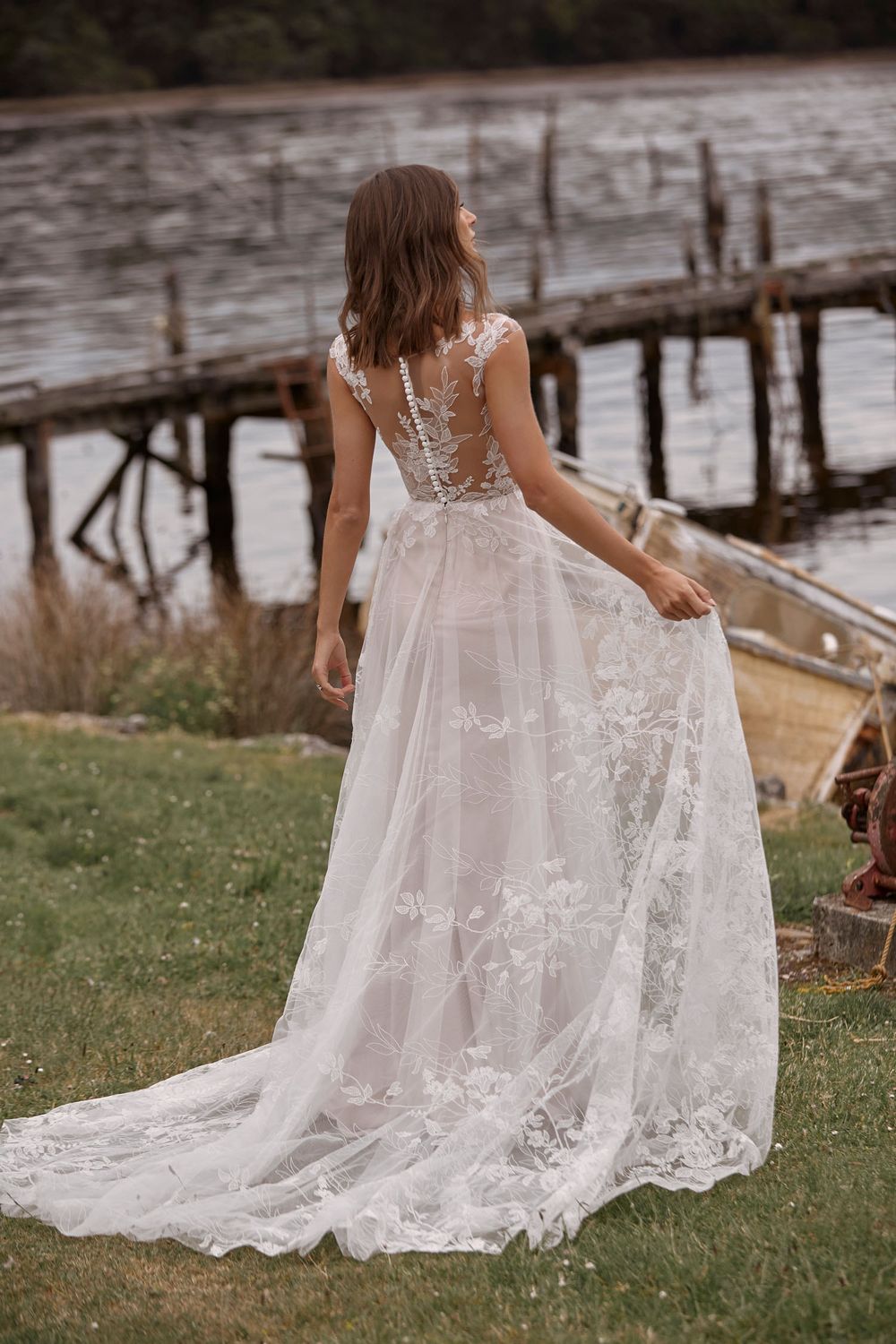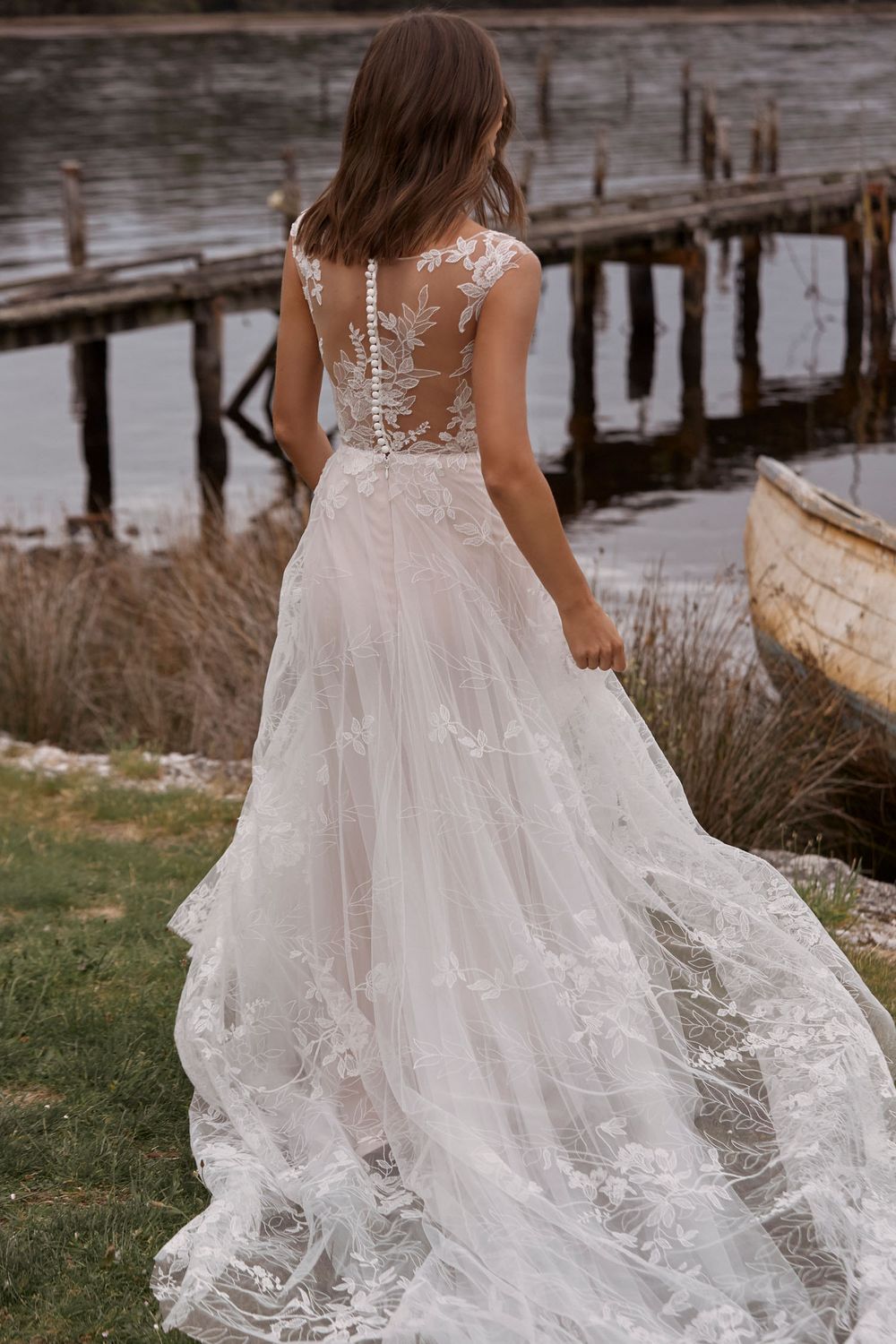 Romantisch all over! De Camille is echt alles wat je wilt voor je bruiloft. Een A-lijn silhouet met zachte lagen tule en geborduurde kanten applicaties. Op de achterkant is een illusion top met picpac knoopjes. Deze jurk is verkrijgbaar in Ivoor/Mokka of Ivoor.