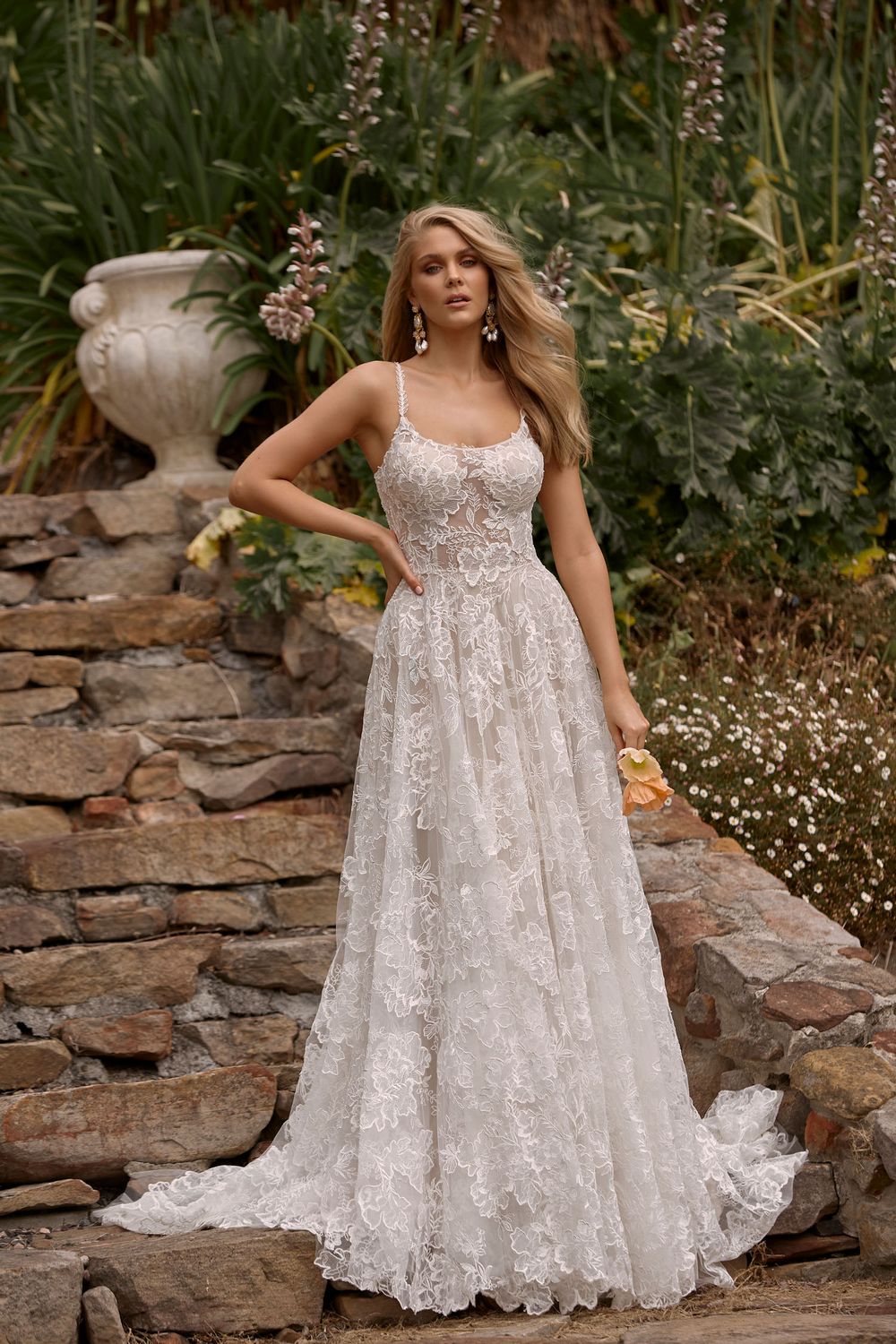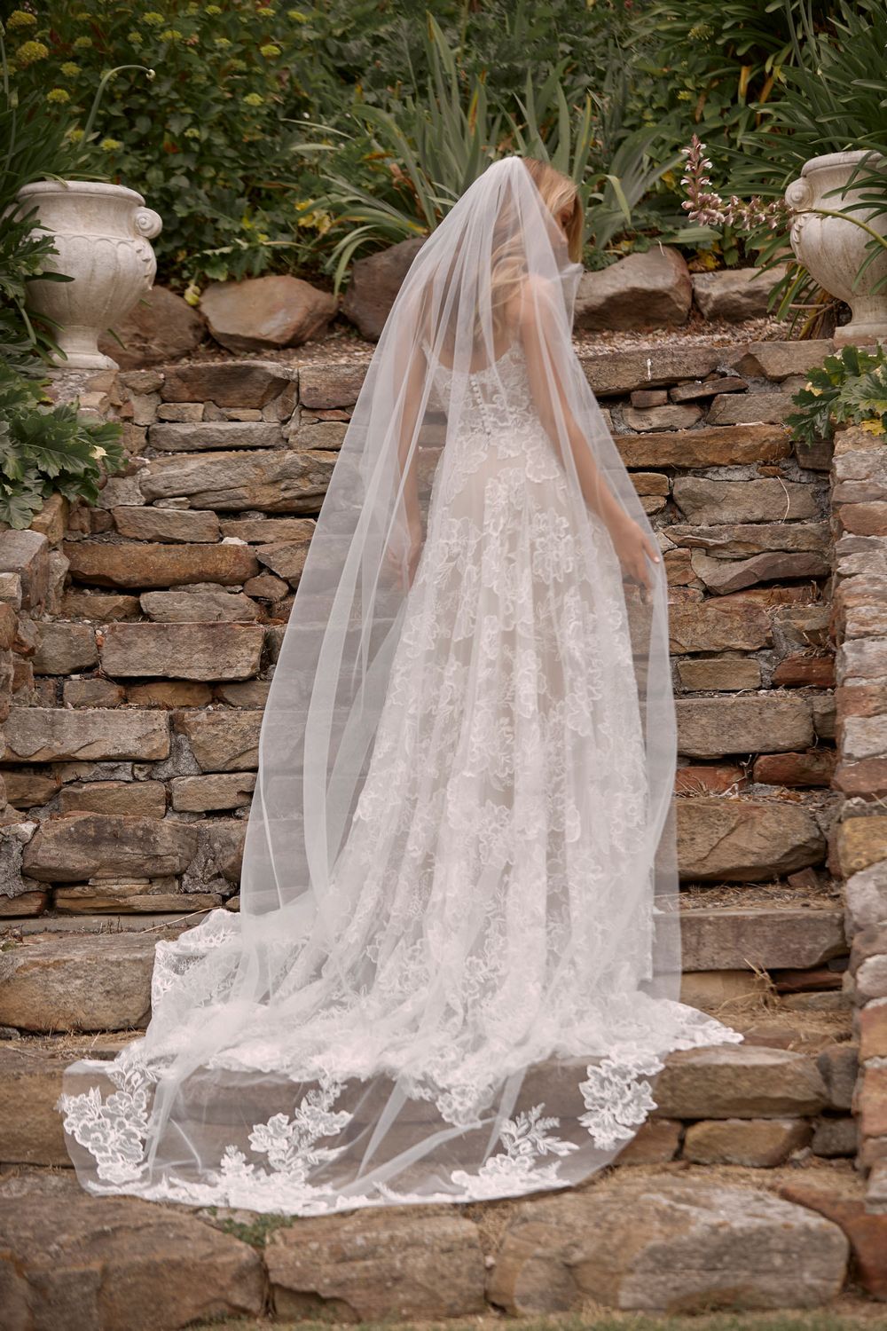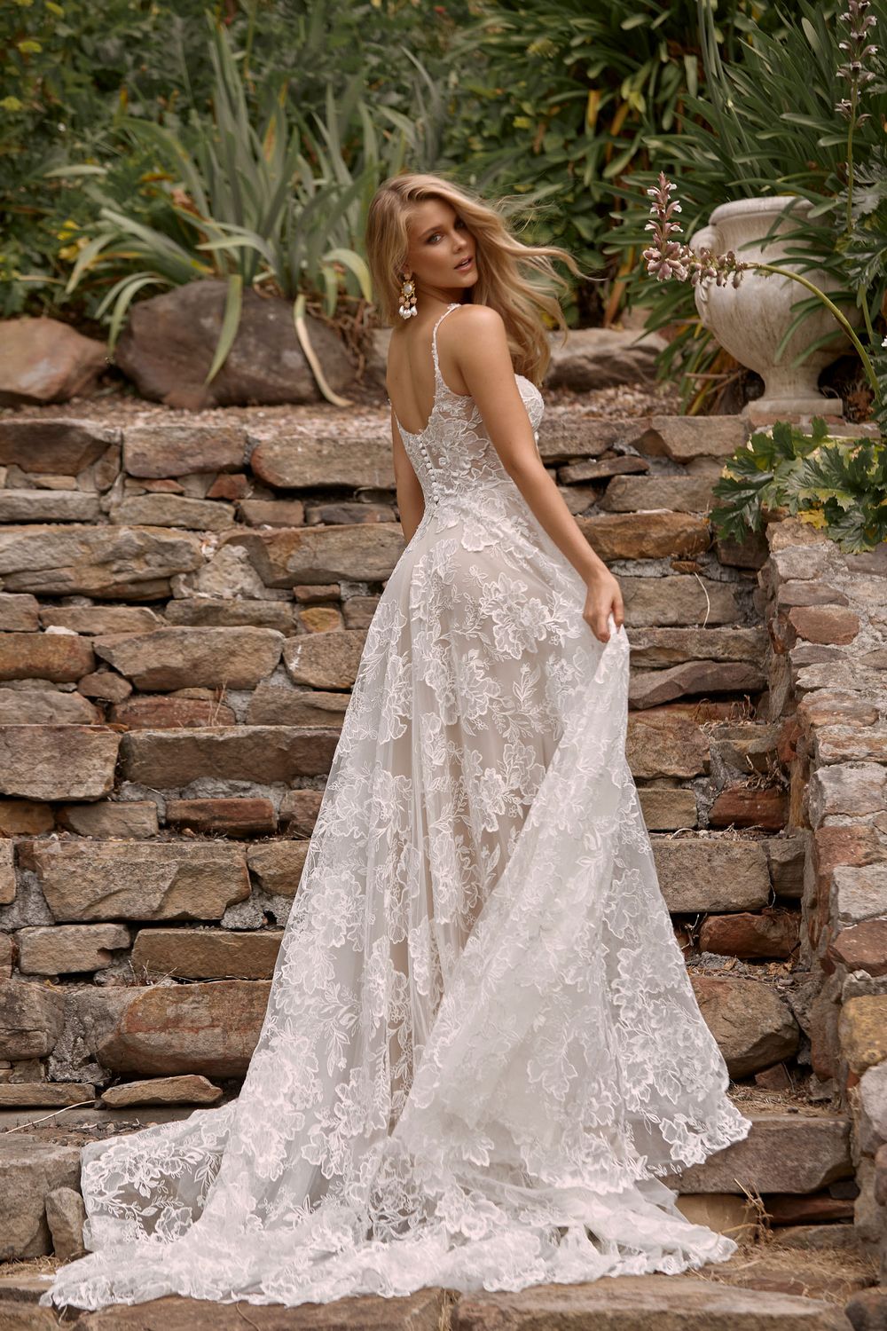 Less is more. Het eenvoudige silhouet heeft een sexy v-halslijn met dunne bandjes. Grafische kanten details versieren het lijfje. Daarnaast heeft deze fantastische jurk twee taille bandjes die de nadruk leggen op jou ongelofelijk mooie taille. De soft crepe siert jouw lichaam fantastisch en de knoopjes lopen door tot aan de sleep. Verder heeft de sleep unieke kanten details. Ready to marry!