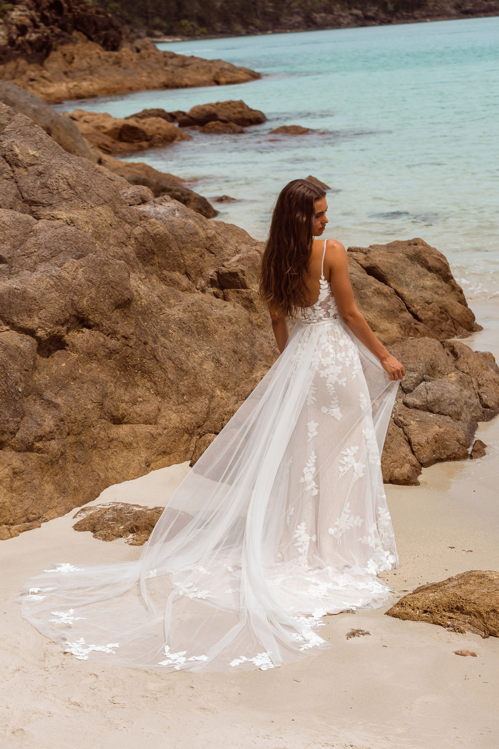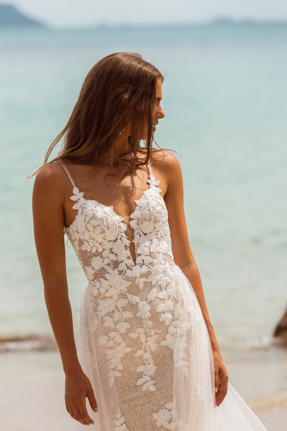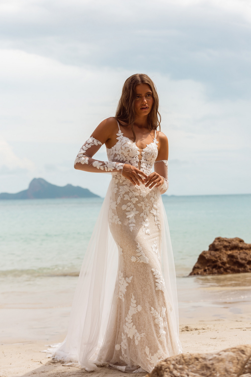 Deze romantische trouwjurk kan op verschillende manieren worden gedragen. De lange mouwen en organza sleep zijn afneembaar wat handig kan zijn voor wanneer je je naar de dansvloer begeeft! De diepe v-hals is omringd door prachtig kant in bloemenmotieven die doorloopt in de fit & flare rok.