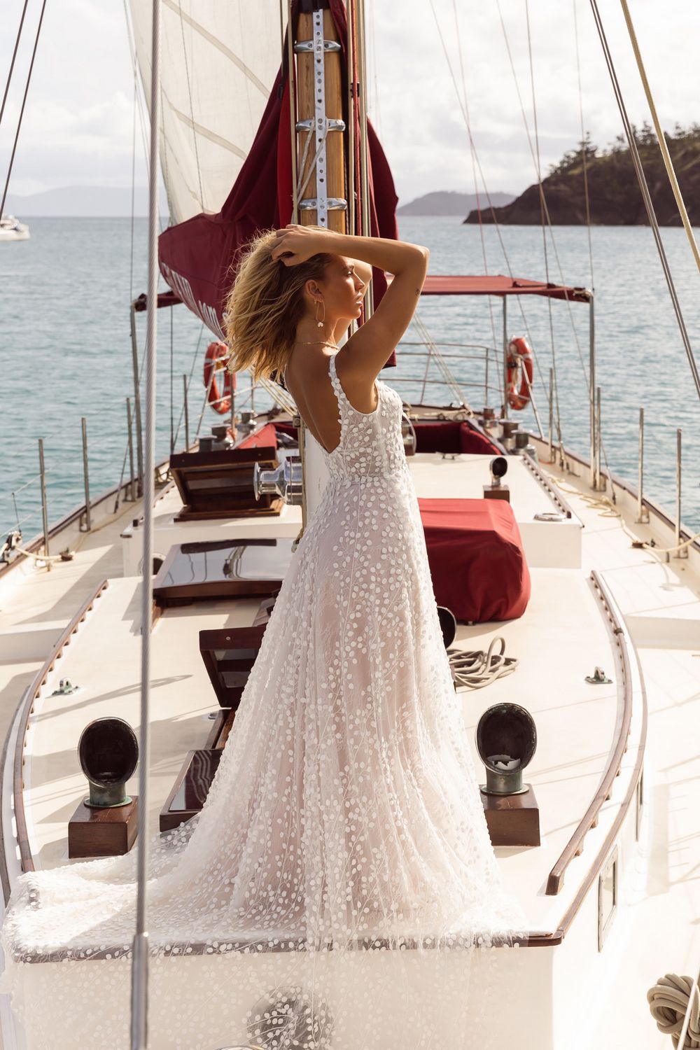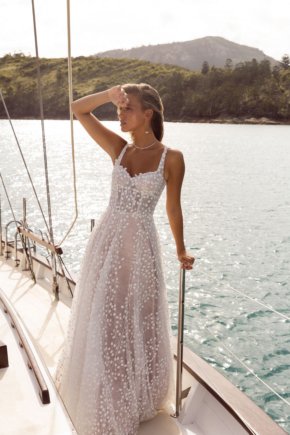 De Jordan trouwjurk is een echte blikvanger! Deze jurk heeft hele bijzonder driedimensionaal kant over de gehele jurk. Het lijfje met een sweetheart halslijn en schouderbandjes accentueert je taille en zit mooi aangesloten door baleinen. De A-lijn rok met de lange sleep vloeit perfect met je bewegingen als je naar het altaar loopt. Een prachtige trouwjurk voor de moderne, elegante bruid.