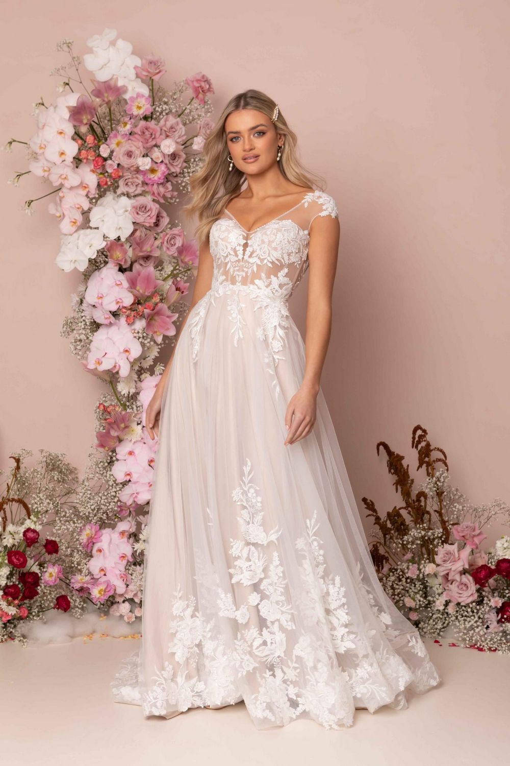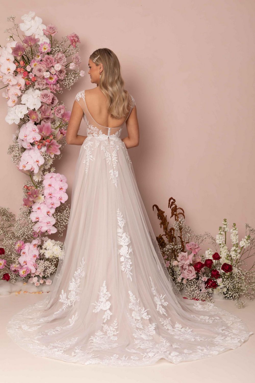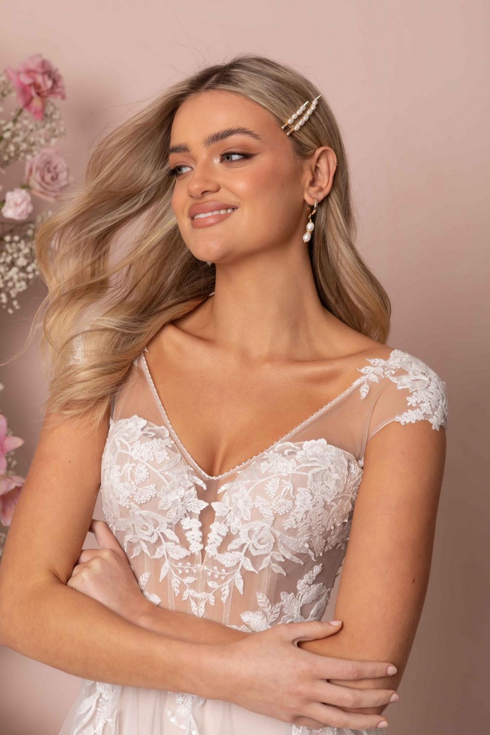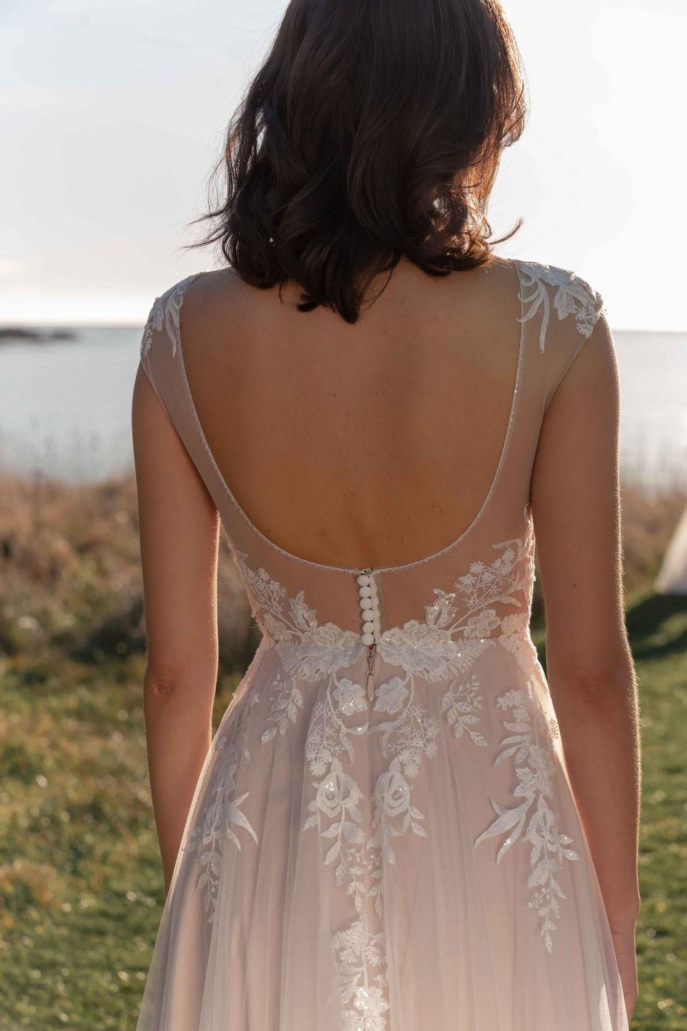 Een prachtig ontworpen trouwjurk voor de moderne bruid die tijdloze elegantie waardeert, dat is de Kirra jurk van Madi Lane. Deze met kant versierde jurk heeft pailletten die glinsteren in het licht. De V-hals en ronde rug zijn afgewerkt met een glitterbandje. De luchtige rok stroomt moeiteloos waardoor er een zwevend effect ontstaat. Een trouwjurk voor een bruiloft op bijvoorbeeld het strand, op een landgoed of in een kas.