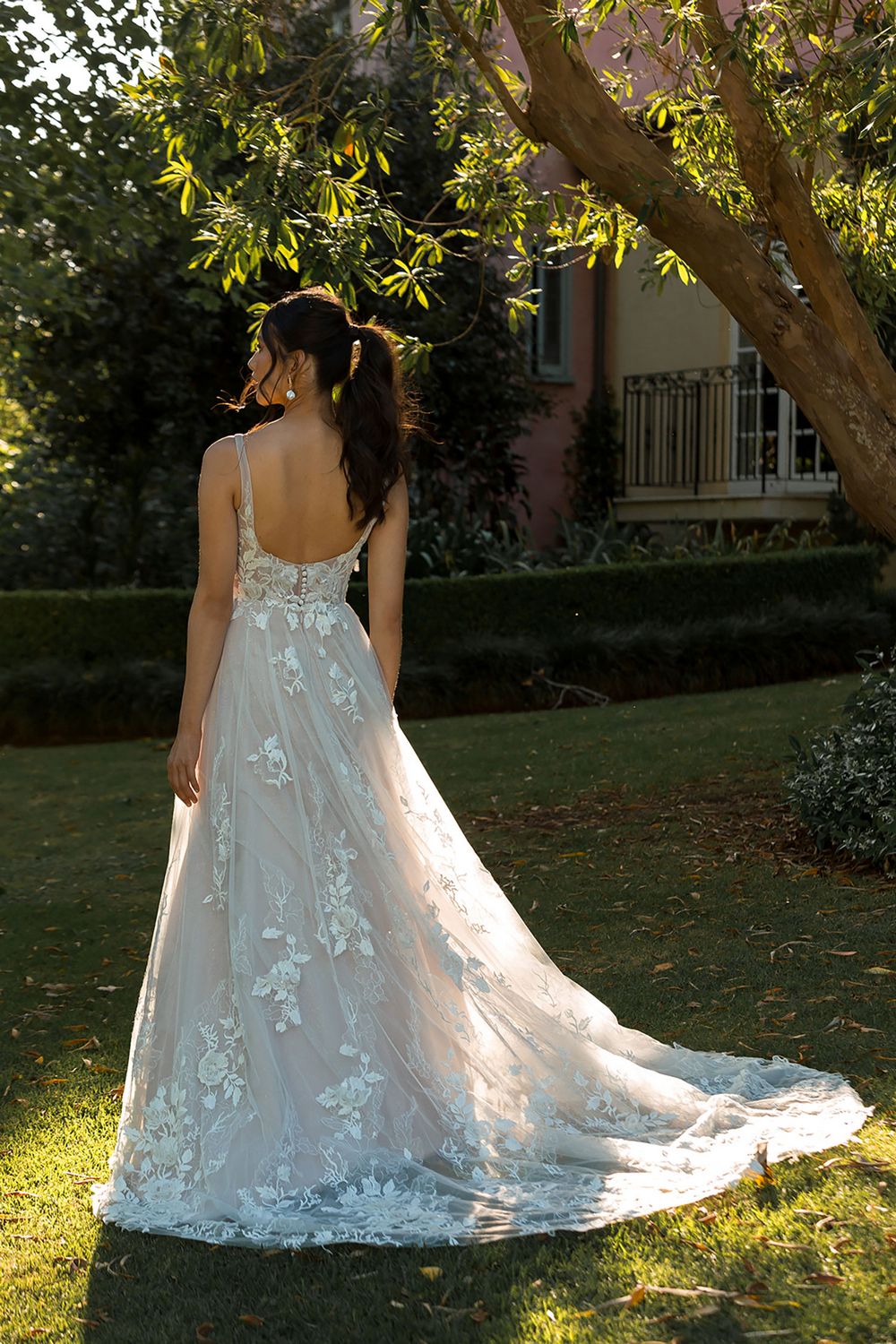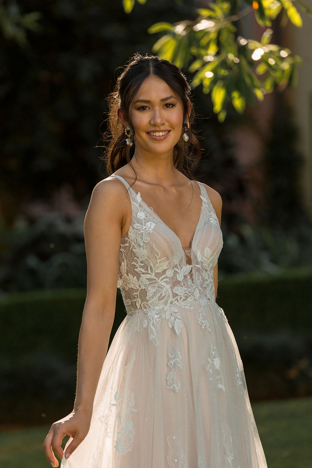 Deze trouwjurk van Madi Lane straalt romantiek uit met eigentijdse charme. De bloemenkant accentueert je taille en de subtiele doorschijnende elementen creëren een betoverende look, terwijl de zachte A-lijn rok zorgt voor een moeiteloos elegante beweging. De Pippa jurk is een ideale jurk voor een bruiloft op het strand, een landgoed of in een kas.