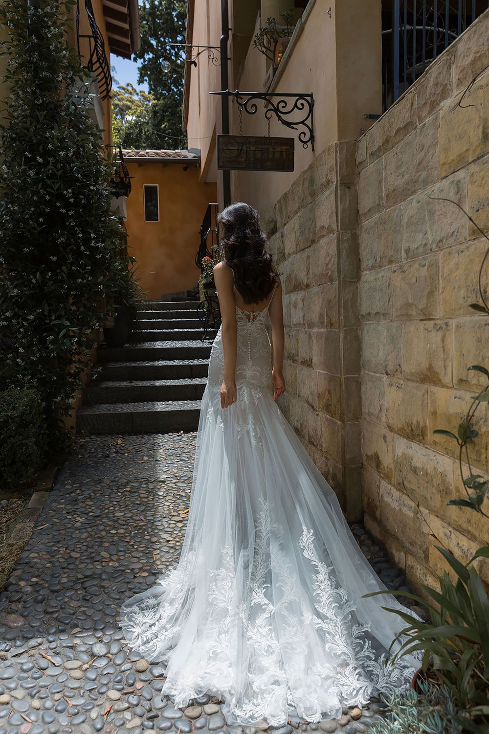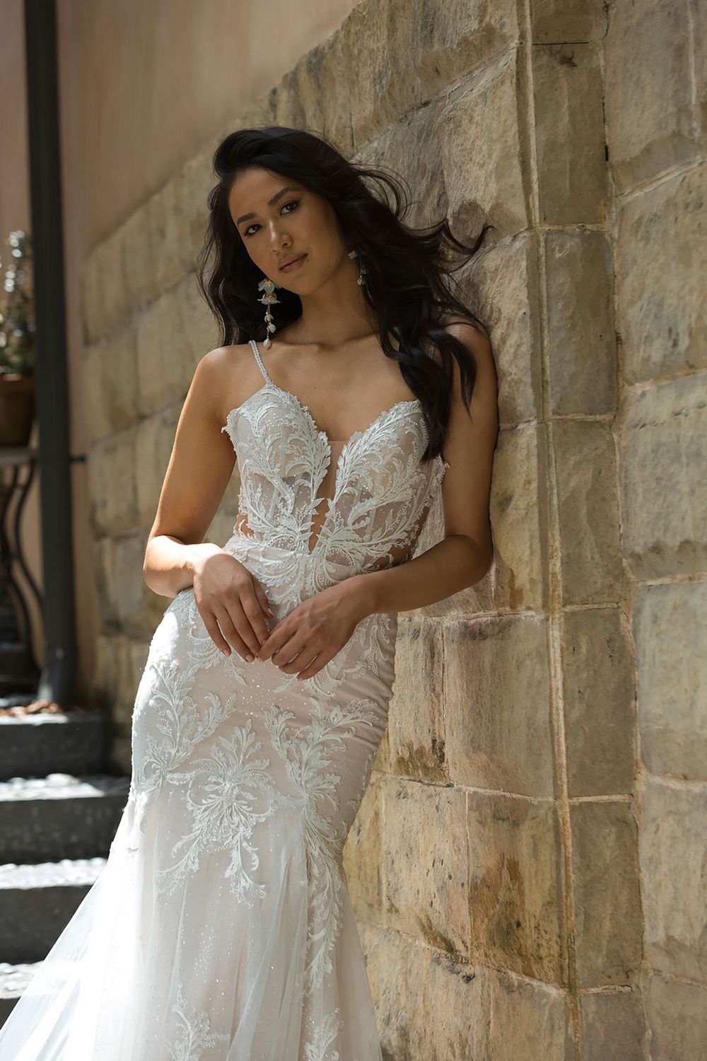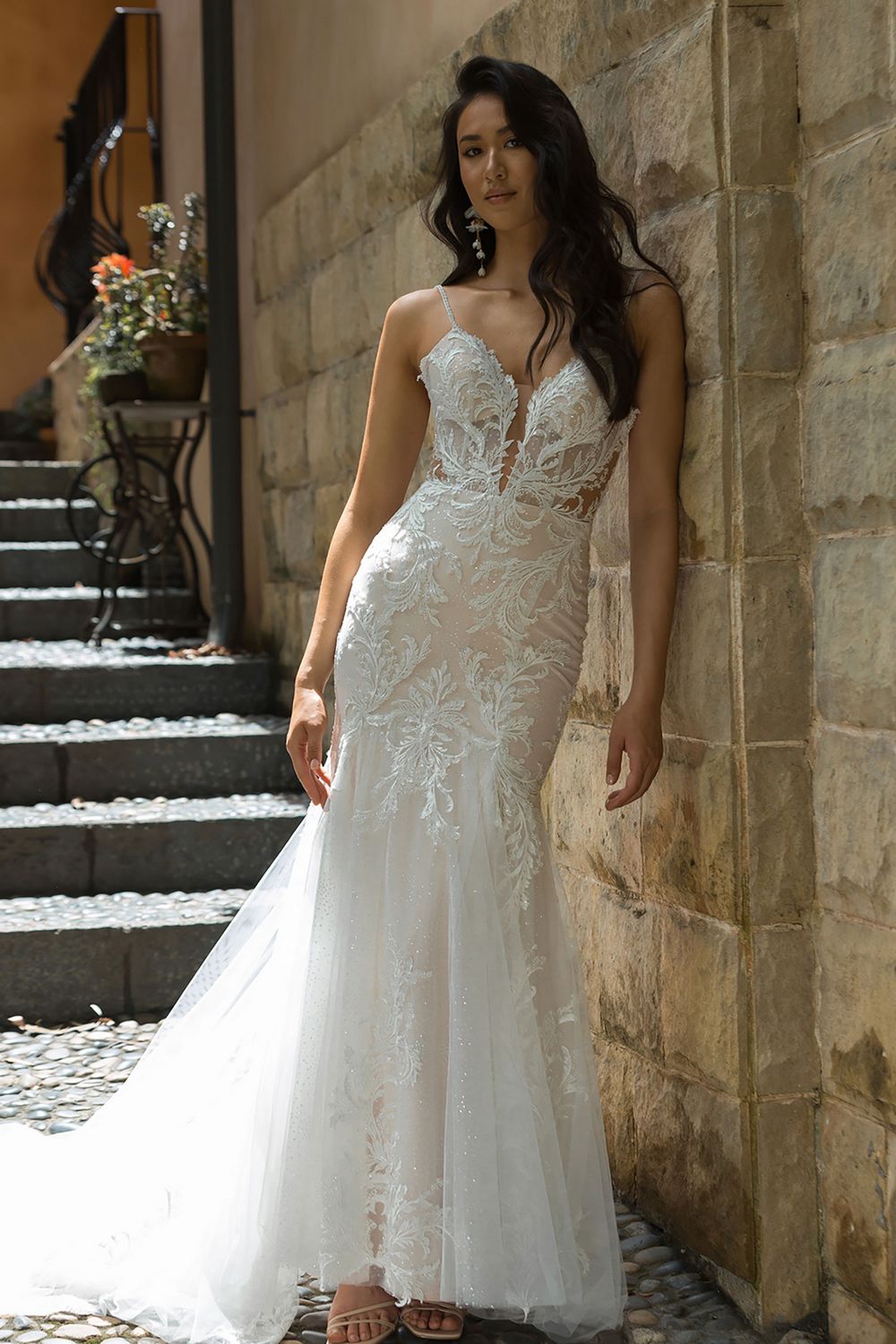 Deze adembenemende trouwjurk is de combinatie tussen sexy en elegant. Met botanisch kant, kralen en pailletten accentueert deze nauwsluitende en uitlopende silhouet je rondingen. Het illusie lijfje en de tule rok creëren een dramatische look.