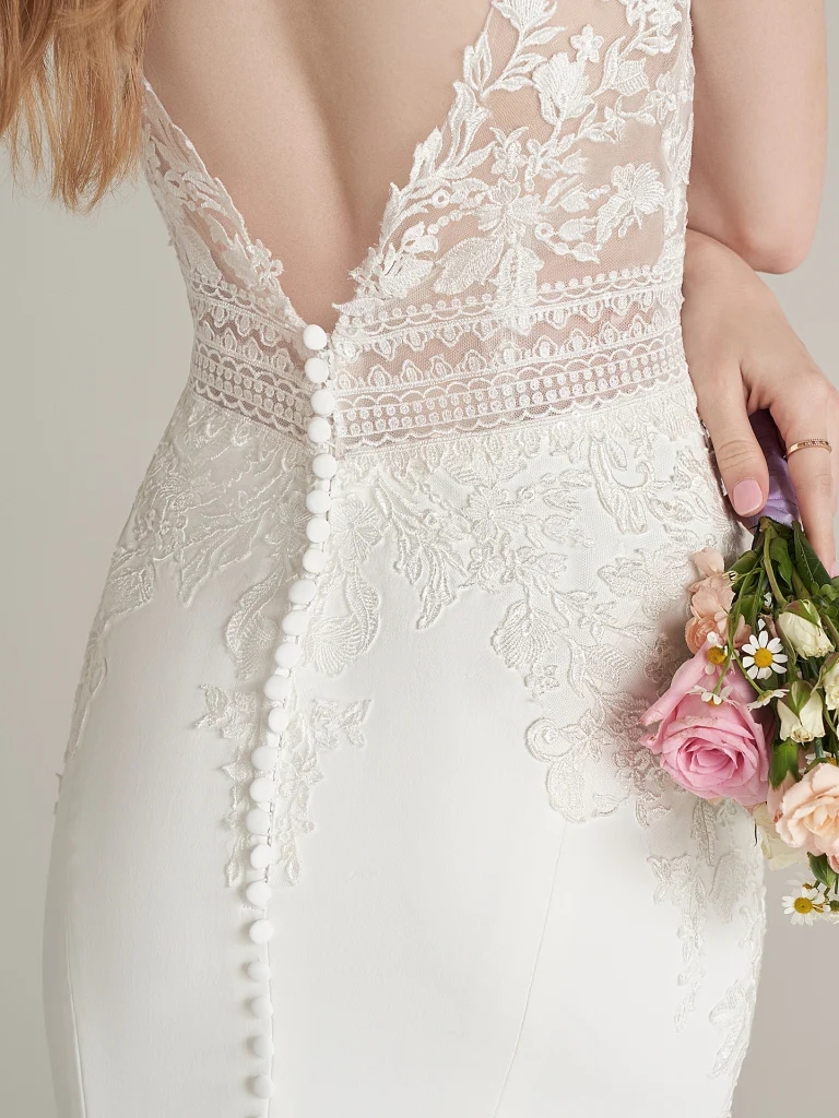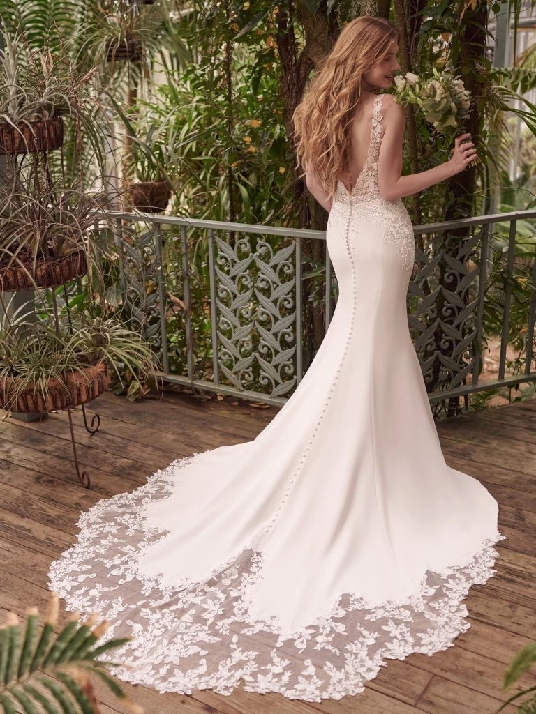 Betty van Designer Maggie Sottero is een prachtige trouwjurk van crêpe met een romantische kanten halslijn die zeker de aandacht zal trekken. Deze elegante jurk is perfect voor elke bruid die zich een prinses wil voelen op haar trouwdag. Het aansluitende lijfje en de vloeiende rok flatteren elk figuur en de delicate kanten details voegen een vleugje elegantie toe. Met deze trouwjurk voel je je gegarandeerd de mooiste bruid van de wereld. Dus waarom zou je jezelf niet een beetje extra geven om je zelfverzekerd en mooi te voelen op je trouwdag?