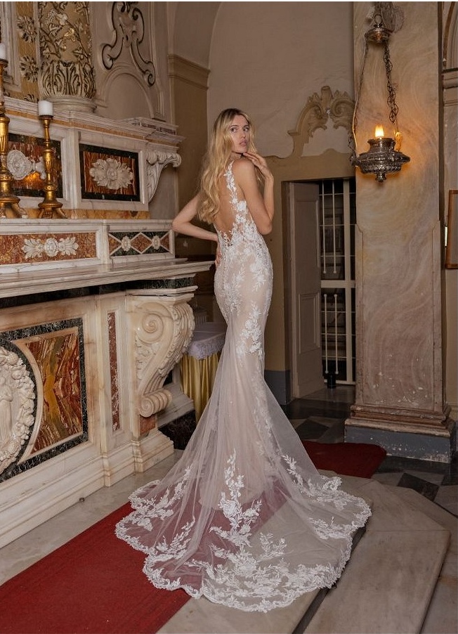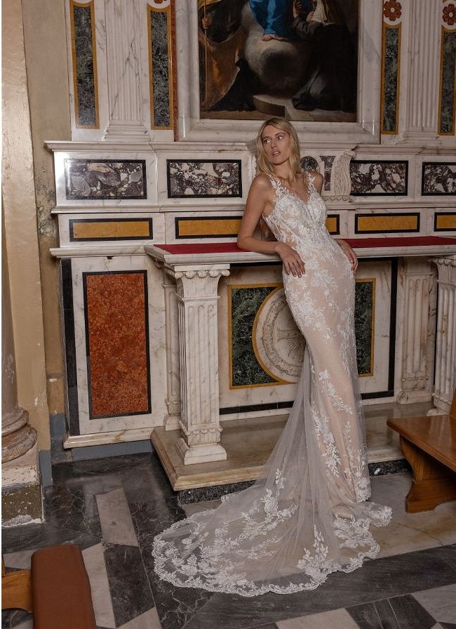 Deze waanzinnige figuurflatterende trouwjurk van Modeca is gemaakt van tule. Het illusie kanten lijfje met kanten bandjes leiden naar een verleidelijke diepe V-hals. De jurk heeft een open rug met een keyhole effect, versierd met de prachtige bloemenkant. Deze bruidsjurk wordt compleet gemaakt met een sleep van kapellengte met kanten applicaties.