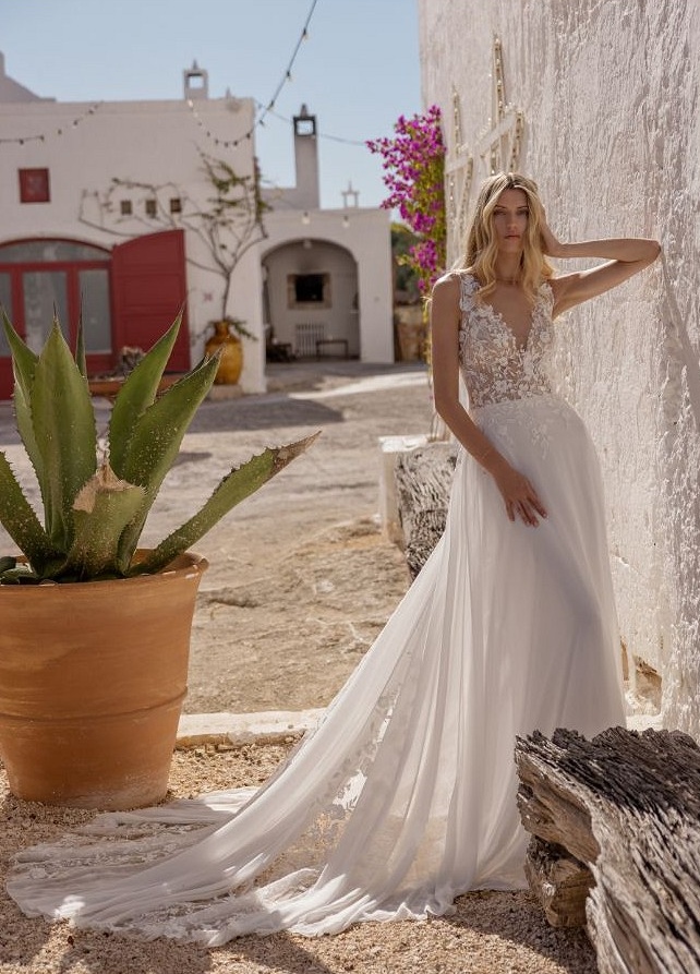 Deze trouwjurk toont een gedetailleerd lijfje met een V-hals. De A-lijn silhouet complimenteert je figuur en de zwierige chiffon rok beweegt prachtig mee met jouw bewegingen op de dansvloer. De illusie kanten rug creëert een opvallend effect dat je er prachtig uit laat zien terwijl je het gangpad afloopt. Door de luchtige chiffon is deze jurk geschikt voor een zonnige bruiloft op het strand.