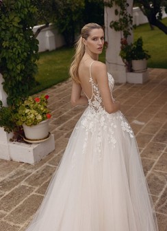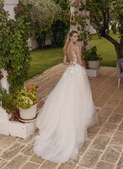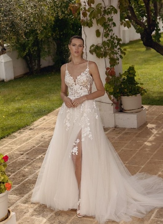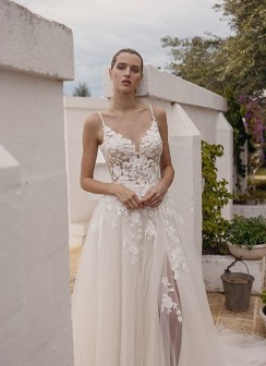 Amarynth trouwjurk is liefde op het eerste gezicht. Het doorzichtige lijfje is ontworpen met een V-halslijn, elegante bandjes met kralen en prachtig gebloemd kant. Dit stijltje is afgewerkt met een lichte tule rok met split, de perfecte manier om een vleugje sexyheid te tonen.
