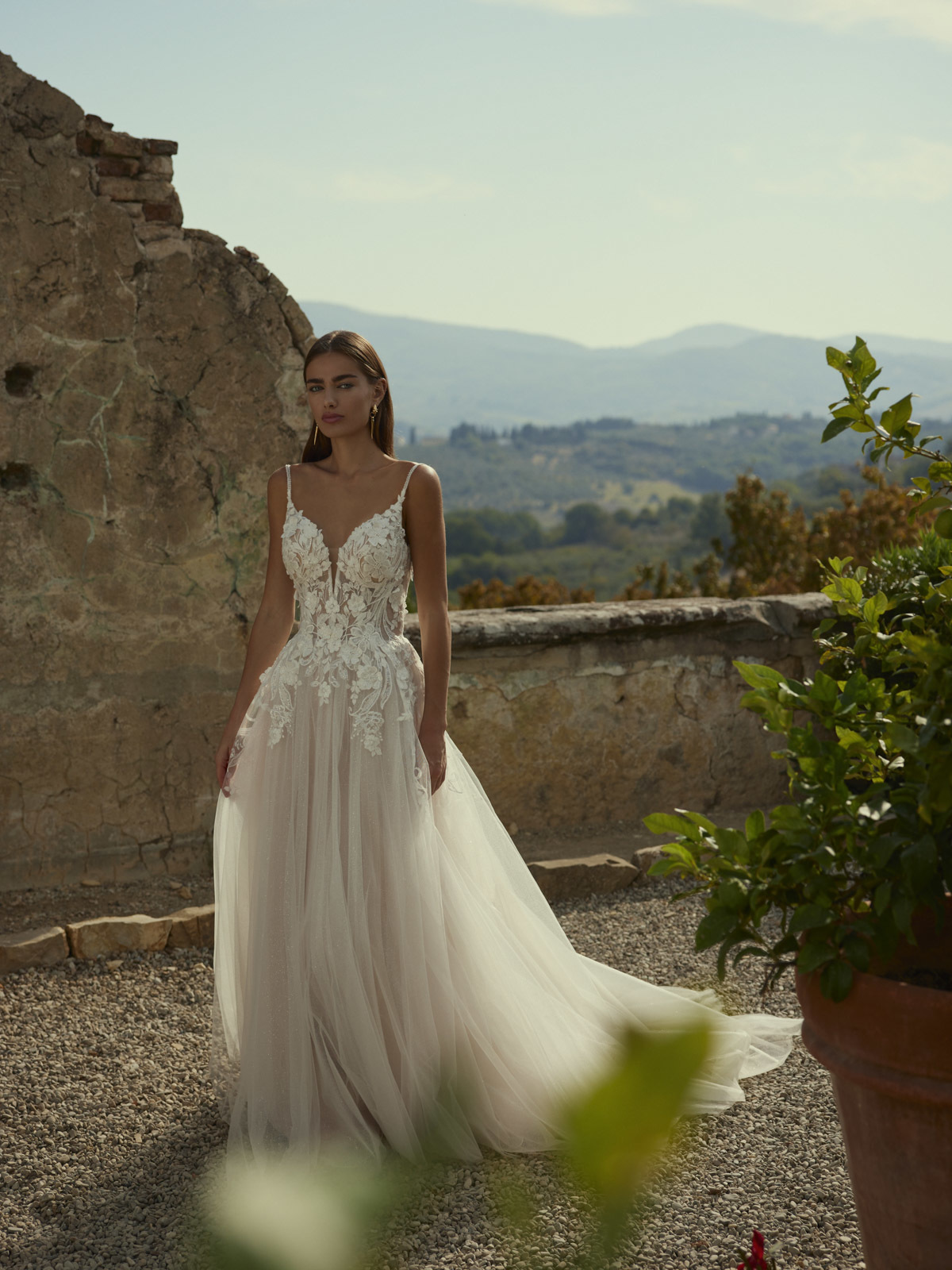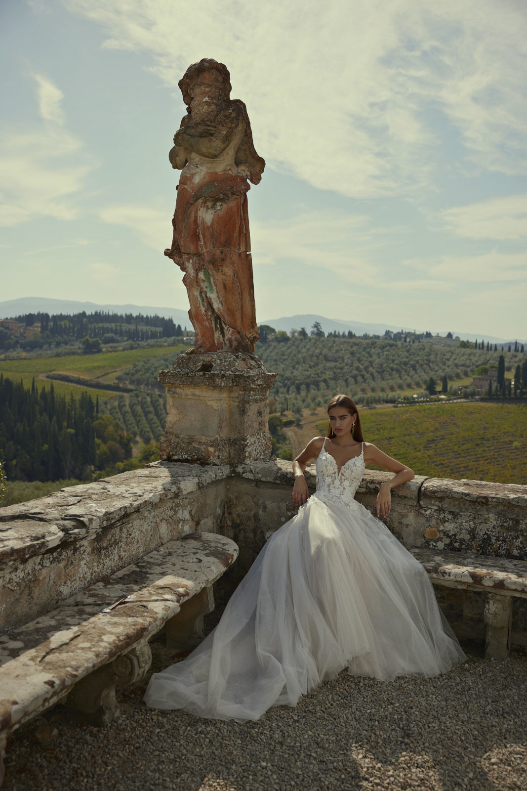 Devondra is de belichaming van tijdloze elegantie en romantiek. Het doorschijnende kanten lijfje is versierd met prachtig 3D bloemen kant, terwijl de parelbandjes een vleugje sprankeling toevoegen. De romantische jurk is afgewerkt met een sprankelende tule rok, versierd met kanten applicaties. Deze jurk is ook verkrijgbaar met gewone tule.