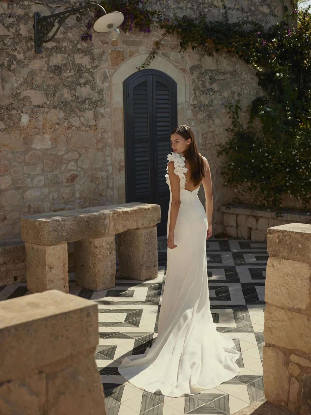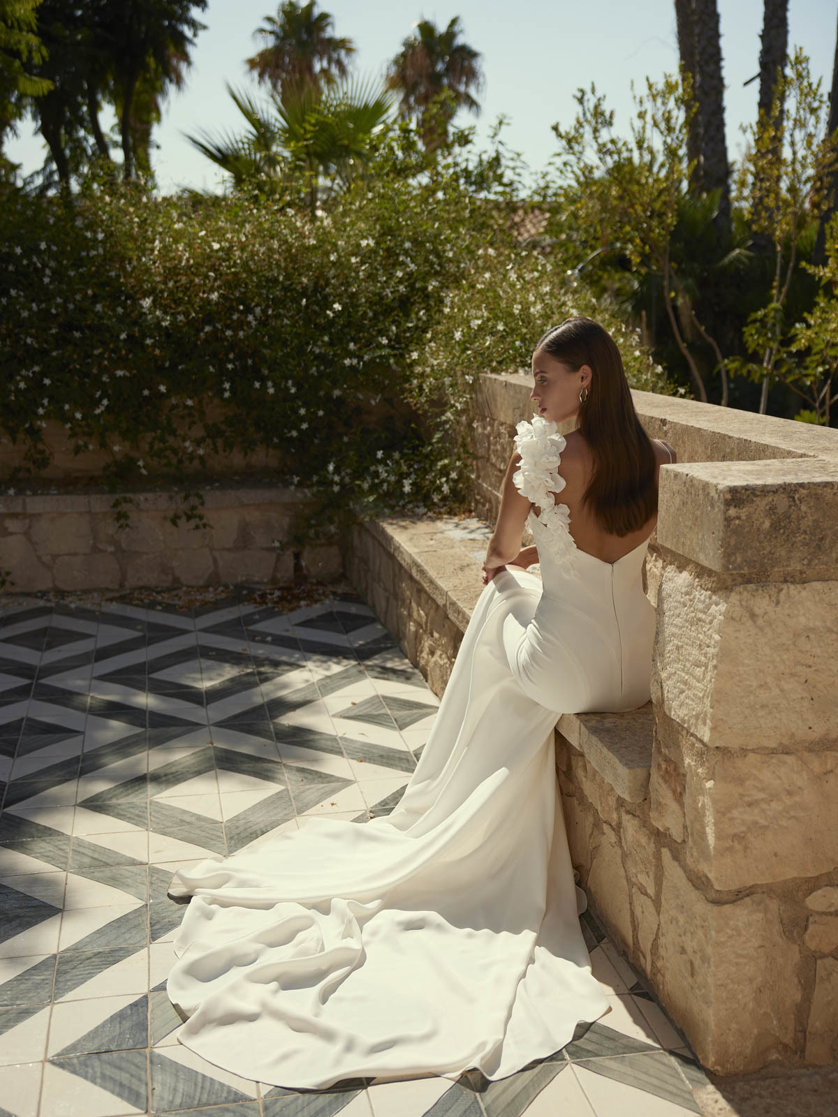 De Elowen trouwjurk is als een betoverend sprookje dat harten verovert en adem wegneemt. De jurk heeft prachtige verfijnde draperieën bij de taille die zorgen voor een elegante silhouet en accentueren je rondingen terwijl je moeiteloos kunt bewegen. Een opvallend kenmerk van Elowen is het prachtige 3D-bloemenkant dat een schouderband siert, waardoor een speelse en vrouwelijke touch aan deze bruidslook wordt toegevoegd.