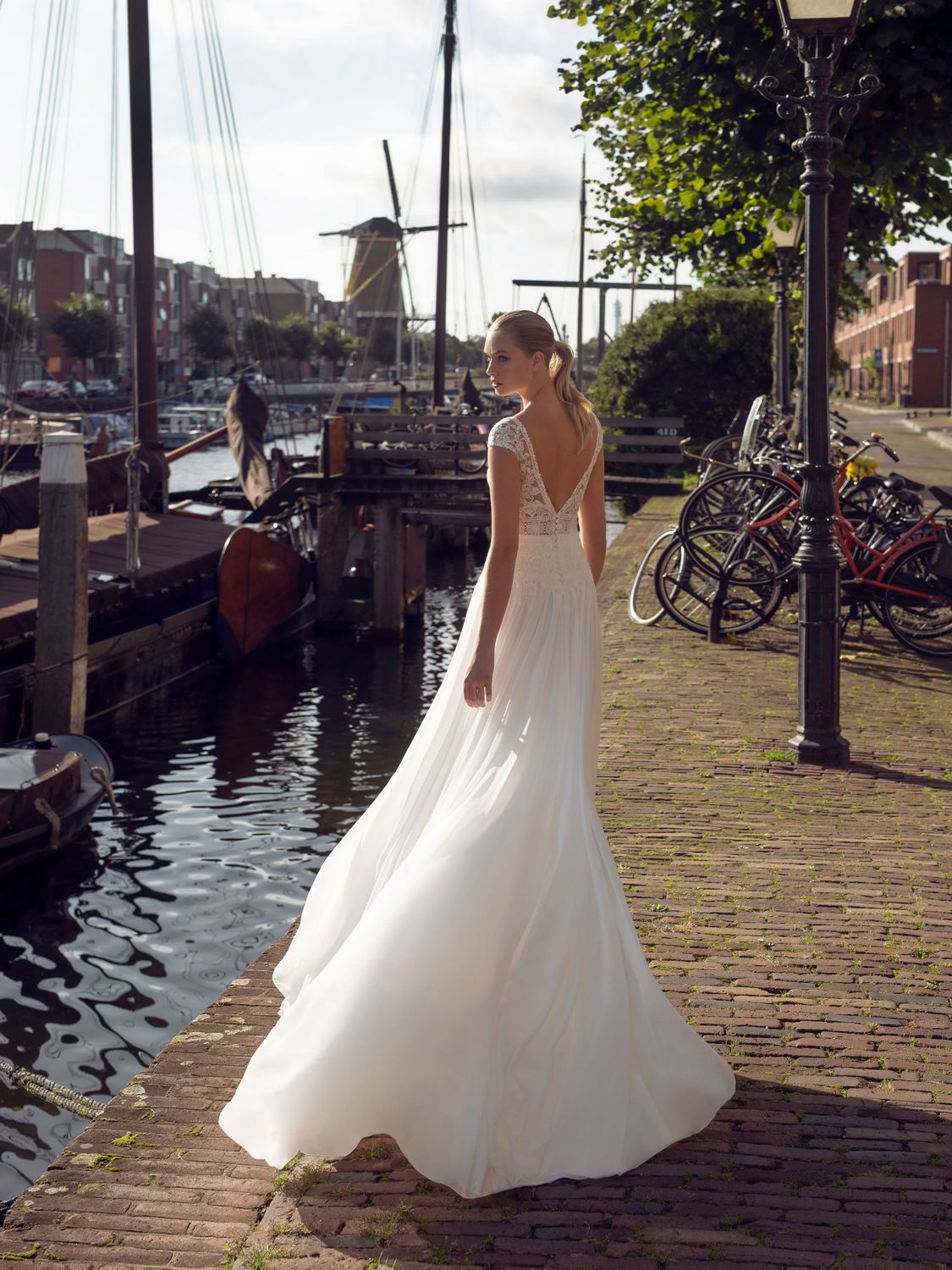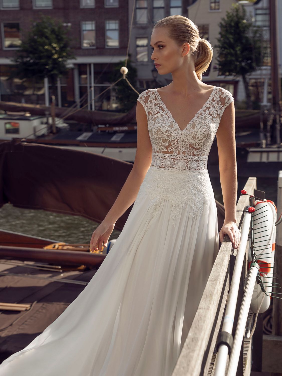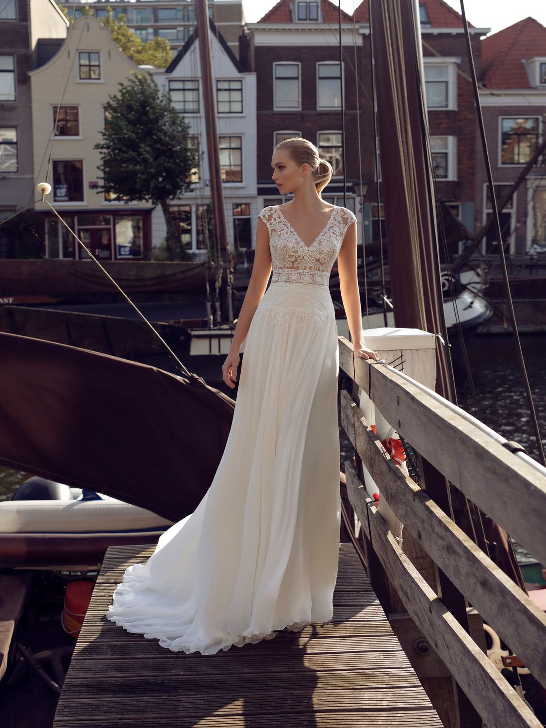 Bruidsjurk Karolina, van het nederlandse merk Modeca, is een prachtige combinatie van bohemien en romantisch. Het doorschijnende kanten lijfje heeft een verhoogde taille en onder de taillelijn loopt het kant nog iets subtiel door op de rok. Een diepe v-hals met kanten off-shoulder schouderbanden, die iets het effect geven van een kapmouwtje, en de diepe v-rug van opengewerkt kant geven deze trouwjurk een prachtige look.
