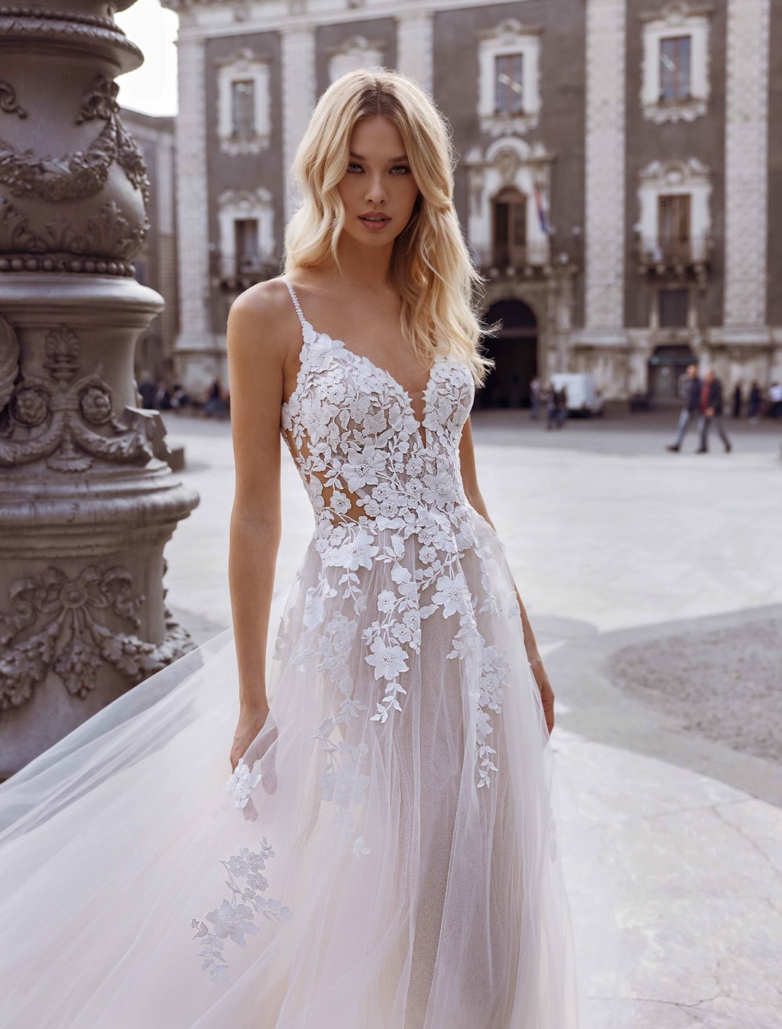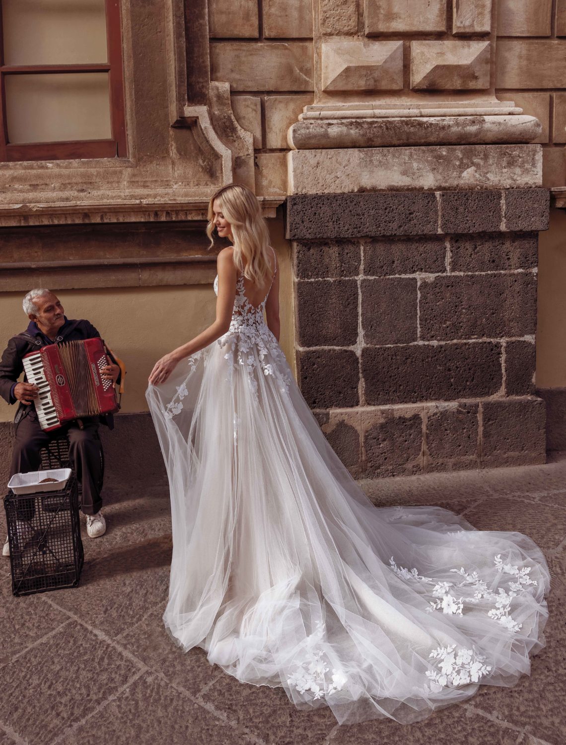 Wat een droom is deze trouwjurk van Designer Modeca! Romantiek en glamour in de vorm van glitters over de hele rok en delicate kanten applicaties op het doorschijnende lijfje. De zijuitsnijdingen geven een sexy touch samen met de diepe v-hals. Door de wijde tule rok zwier je elegant naar het altaar. Perfect voor jouw bruiloft op het strand, bos, of in een kasteel.