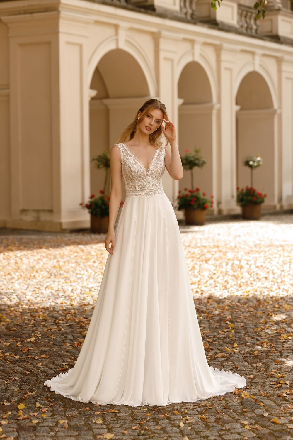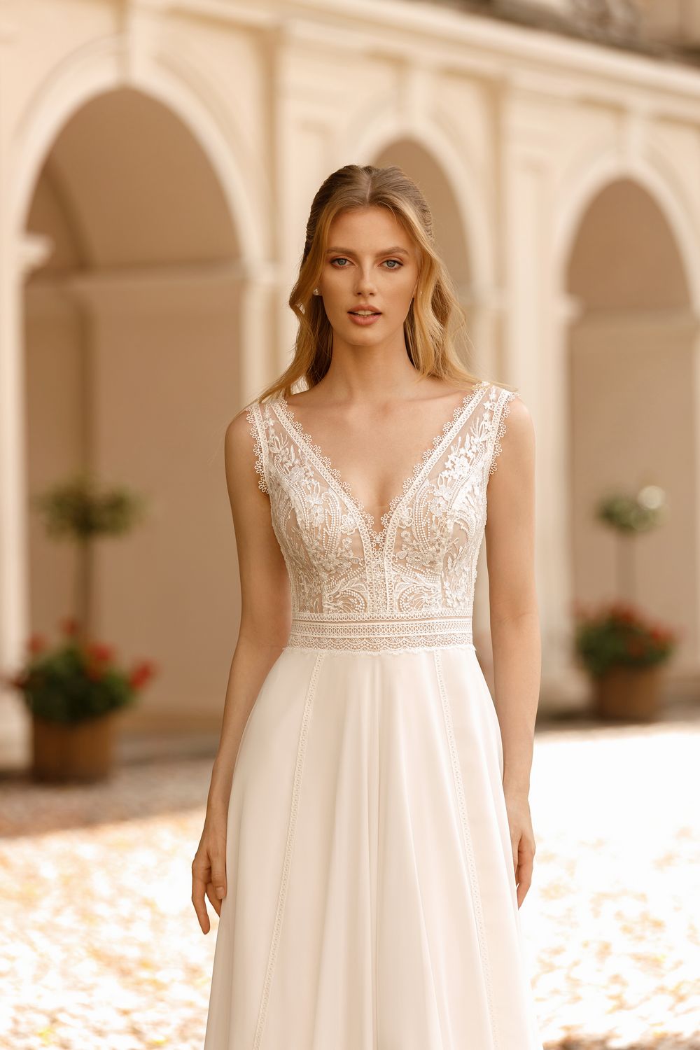 Deze jurk van Monica Loretti heeft een aangesloten kanten lijfje met schouderbandjes en een romantische V-hals. De rok vloeit perfect mee met jouw bewegingen door de soepelvallende stof. Dit A-lijn model staat iedereen mooi en door de luchtigheid is de rok zeer geschikt voor een zomerse bruiloft op het strand.