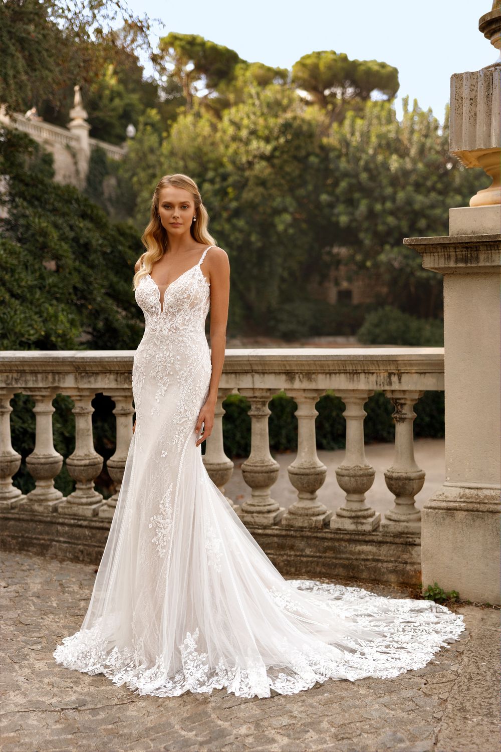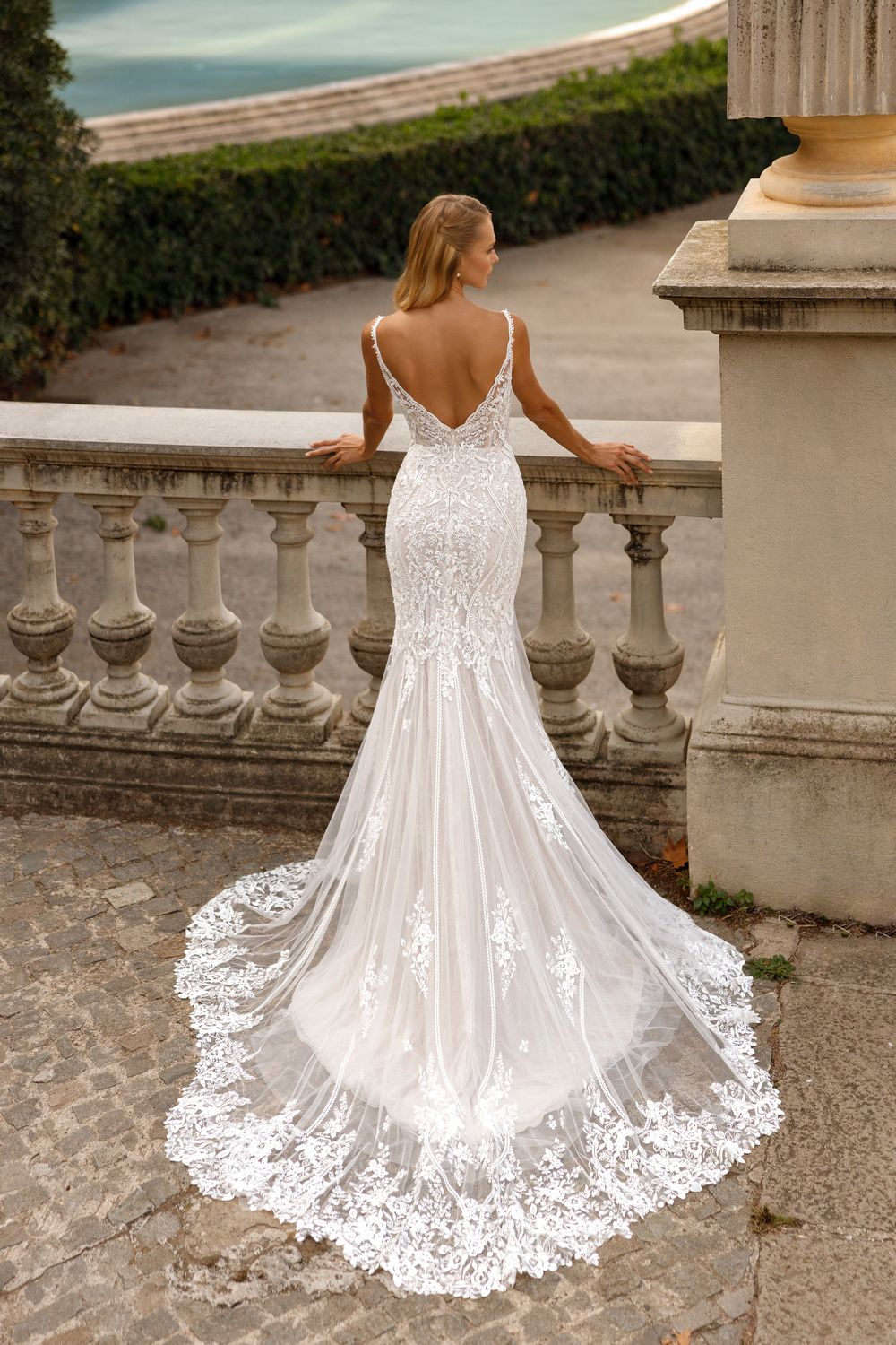 Ervaar pure romantiek in deze trouwjurk van het Italiaanse merk Monica Loretti. Met luxueus kant en tule omarmt deze jurk moeiteloos een betoverende uitstraling. De illusie halslijn en het prachtig versierde lijfje geven een vleugje verfijning, terwijl de zachte, vloeiende rok bij elke stap voor gracieuze beweging zorgt. De jurk heeft smalle schouderbandjes en een lage rug voor een flirterige uitstraling. De sleep is prachtig afgewerkt met kanten applicaties.